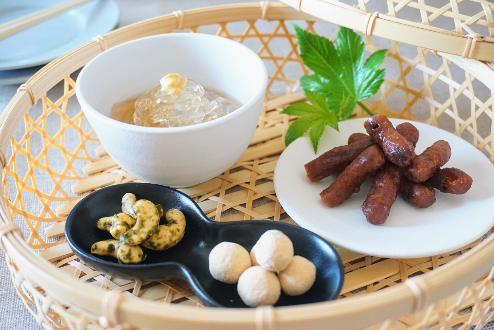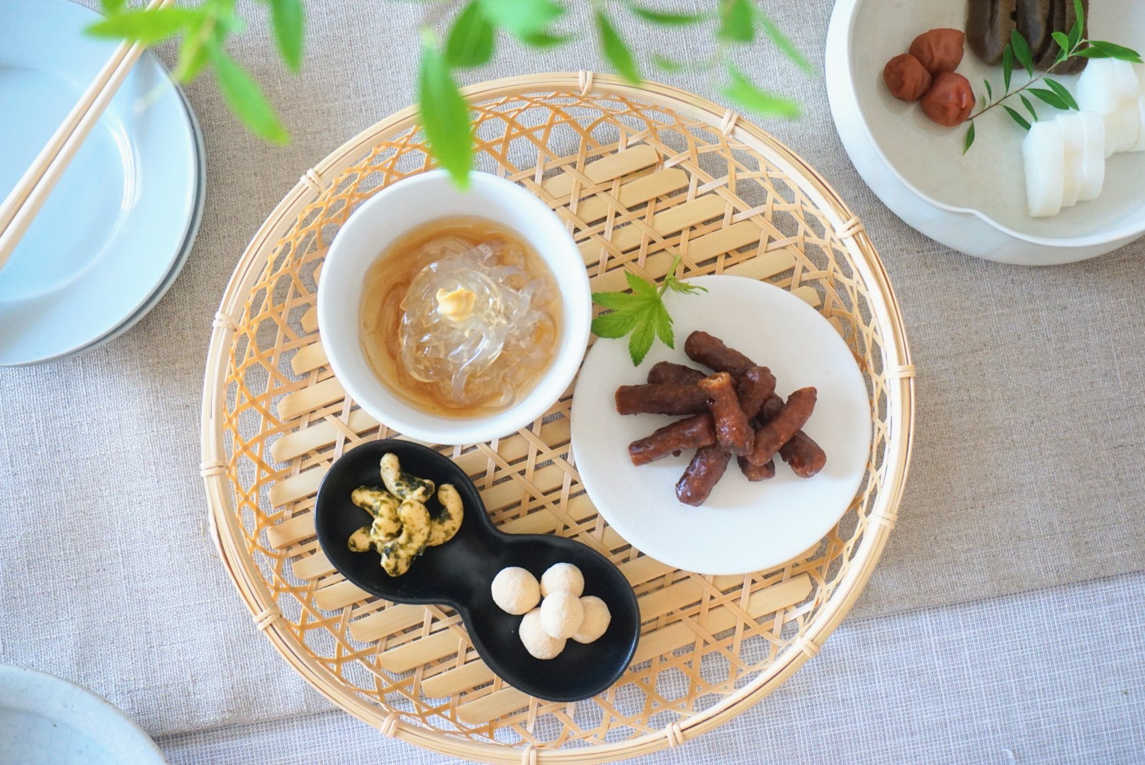 「和菓子で夏のおもてなし」 暑い夏。 目で感じる涼しさを取り入れた和のおもてなし。 和食器でほっとする安らぎ、 籠で夏の暑さに涼しさを表現しました。