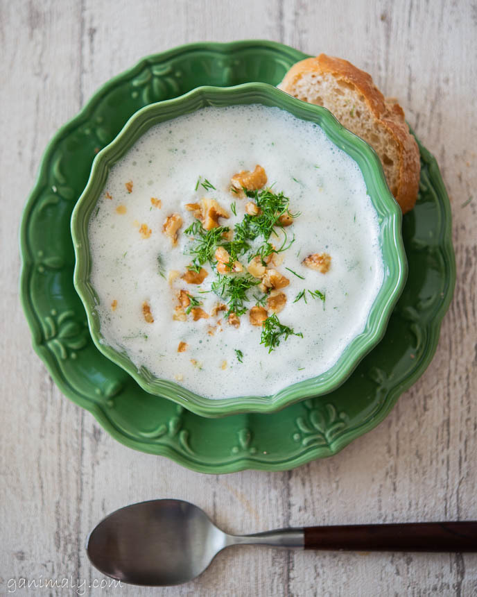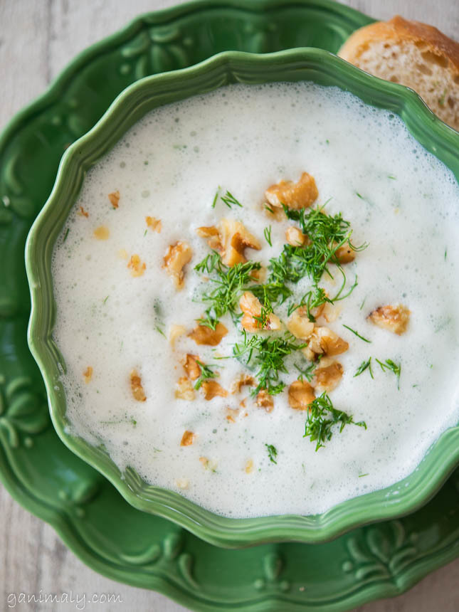 - 2つのスープ皿に注ぎ、ディル(大さじ1/2)とくるみ(大さじ1/2)を砕いてを振り、オリーブオイル(大さじ1/4)を回しかける。