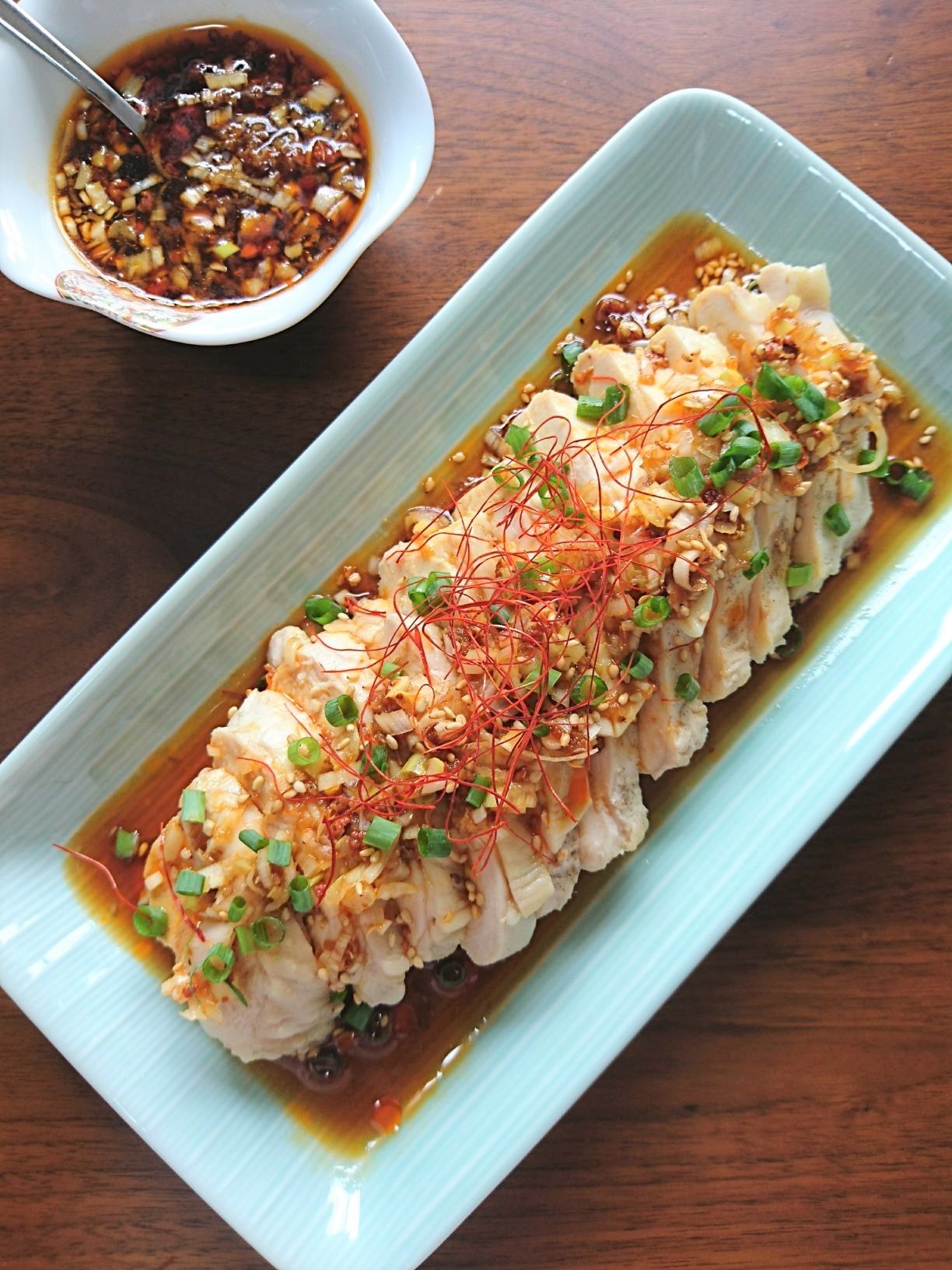 - 鶏肉の粗熱がとれたら食べやすい大きさに切る。器に盛って3をかけBをトッピングする。