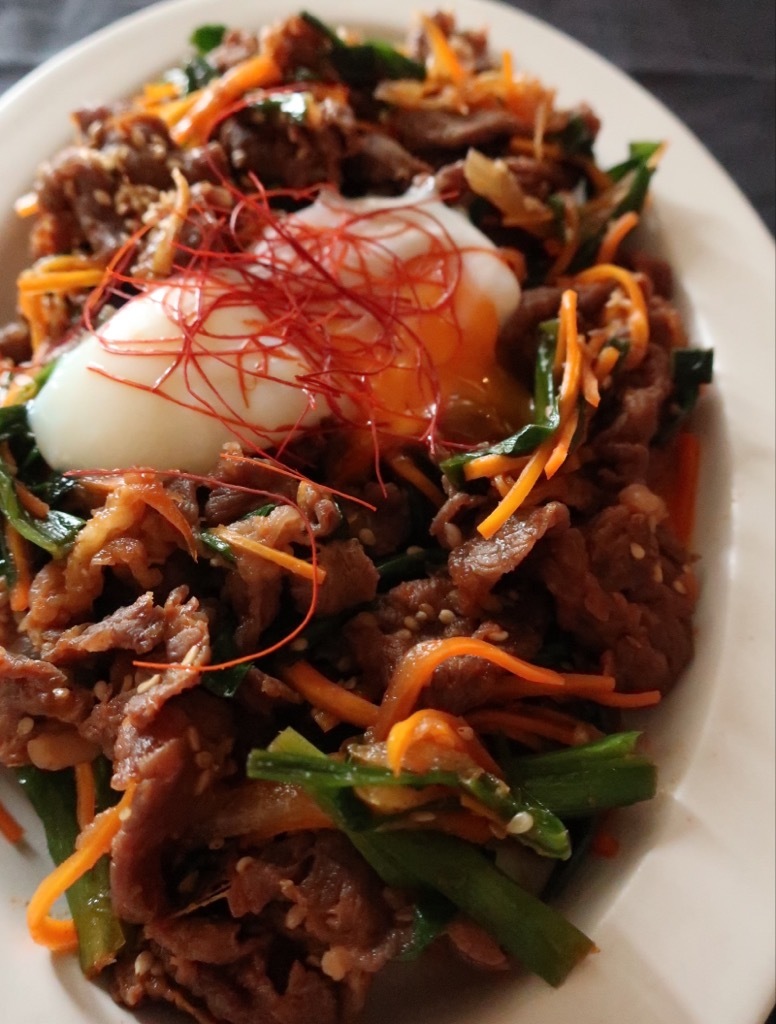 梨を千切りにして牛肉と漬け込むことでやわらかく、ジューシーな仕上がりになります。温泉卵をのせてマイルドになりご飯が進む一品です。