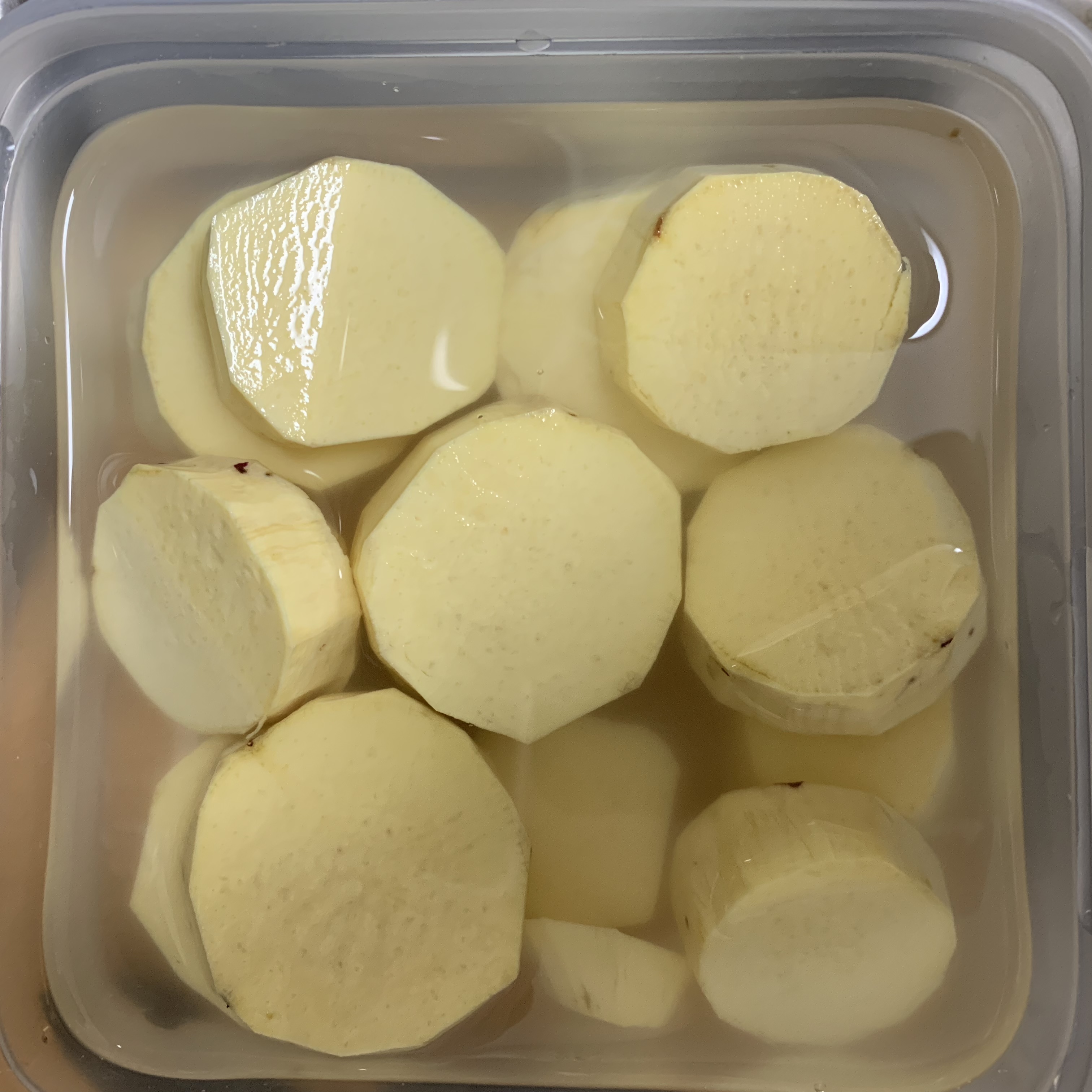 - さつまいもは皮をむき、厚さ1cmの輪切りにし、(大きい場合は半月切り)水にさらす。