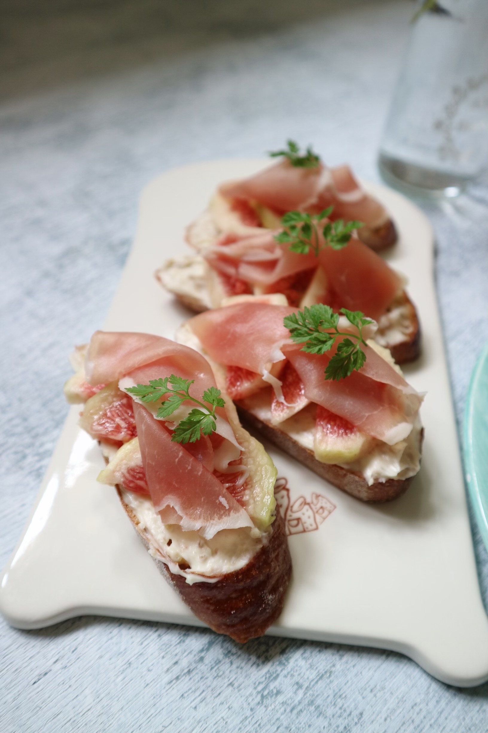 - バゲットに①を塗り、いちじく・生ハムを彩りよくのせ、セルフィーユを飾る。