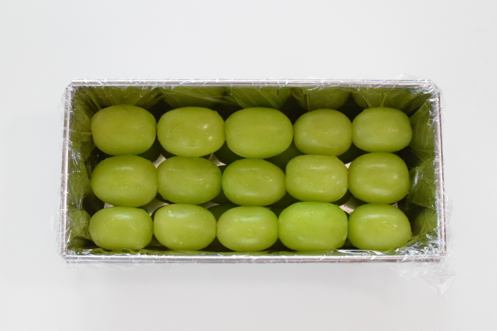 パウンド型に半割したシャインマスカットを切り口を下に向けて敷き詰める。