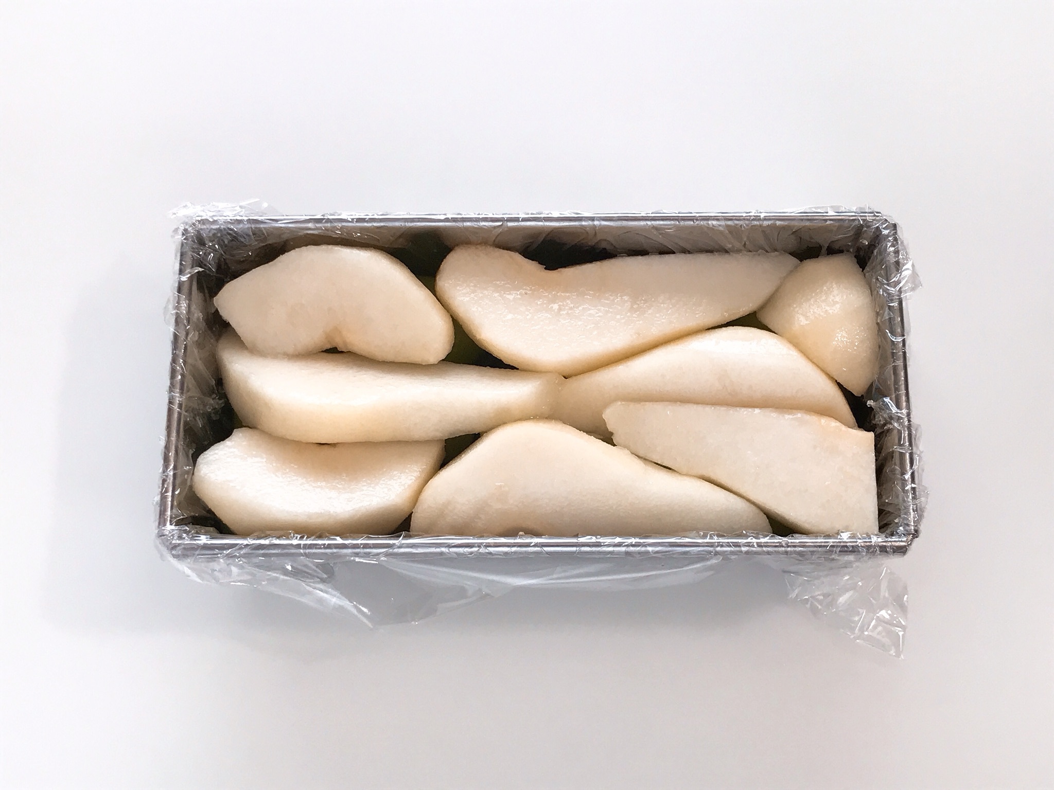 洋梨を型に並べる際、隙間が空く場合は隙間に合わせて切り、埋めるように並べます。