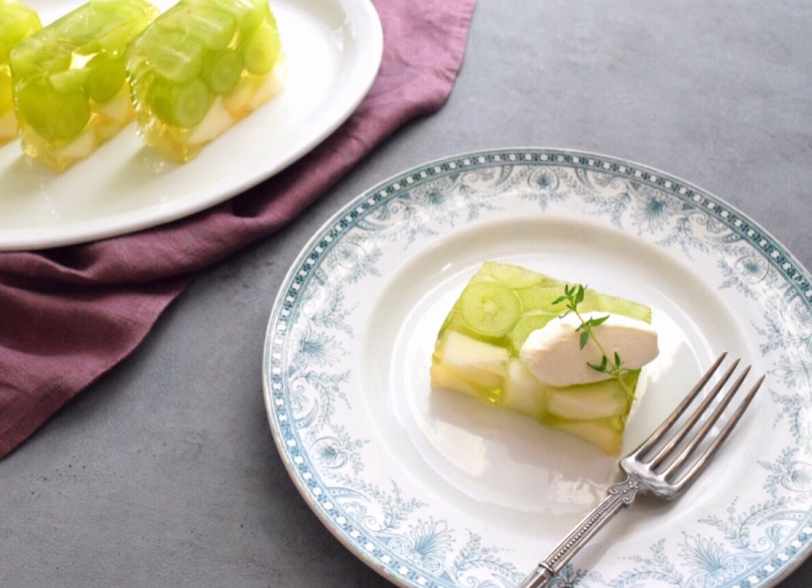 その上にシャインマスカット(半割にしてないもの)、洋梨の順に敷き詰める。