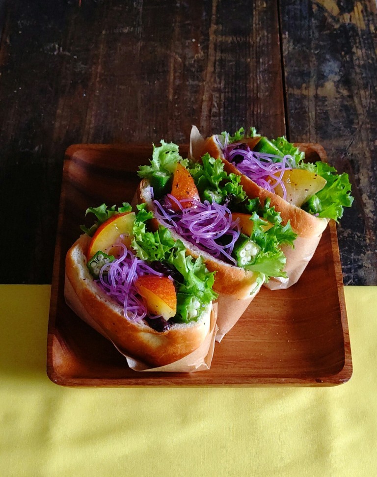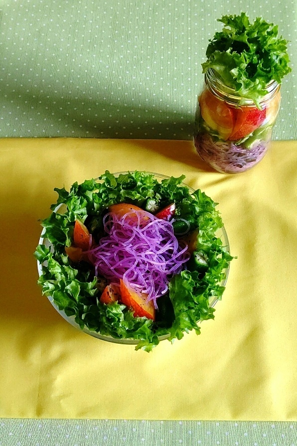 - 240mlの瓶にオリーブ油を入れ、①の緑豆春雨、オクラ、スモモの順に入れる。フリンジレタスを食べやすい大きさにちぎり、瓶から少しはみ出す高さまで詰める。