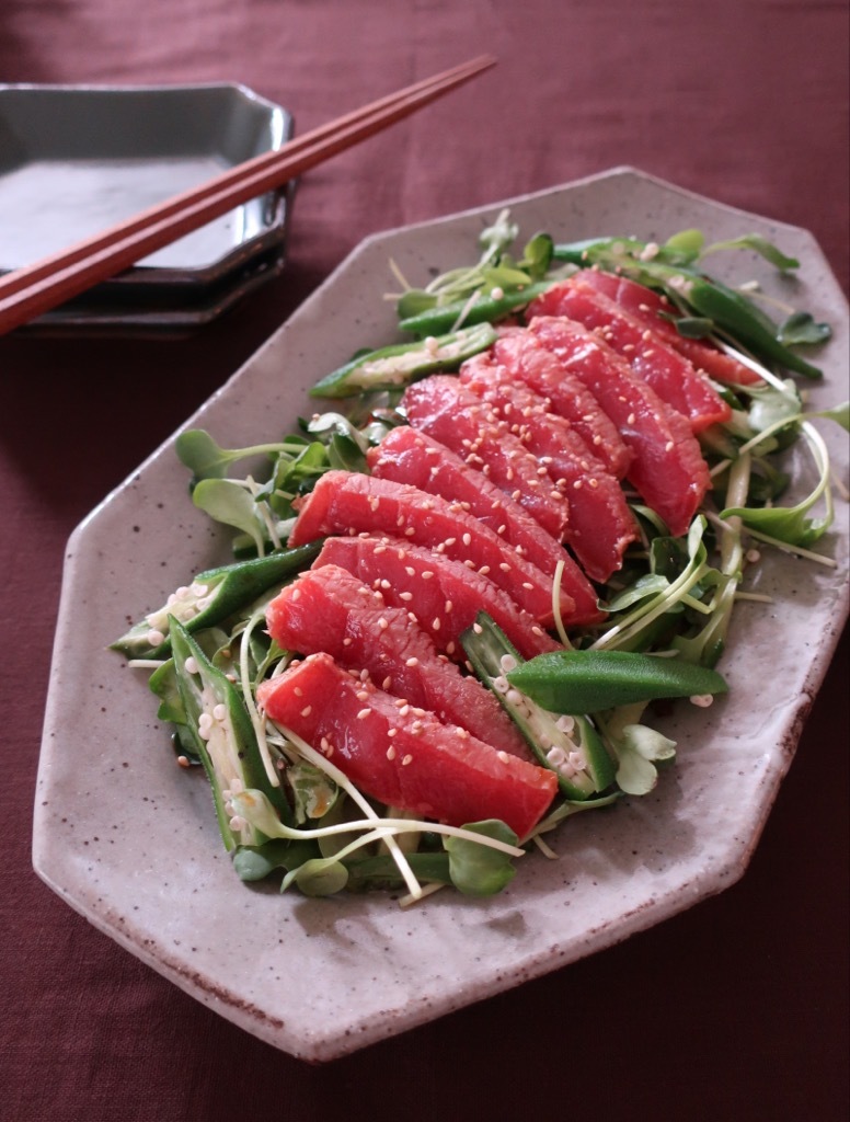 さっと湯通ししたマグロをタレにつけてサラダにしました。