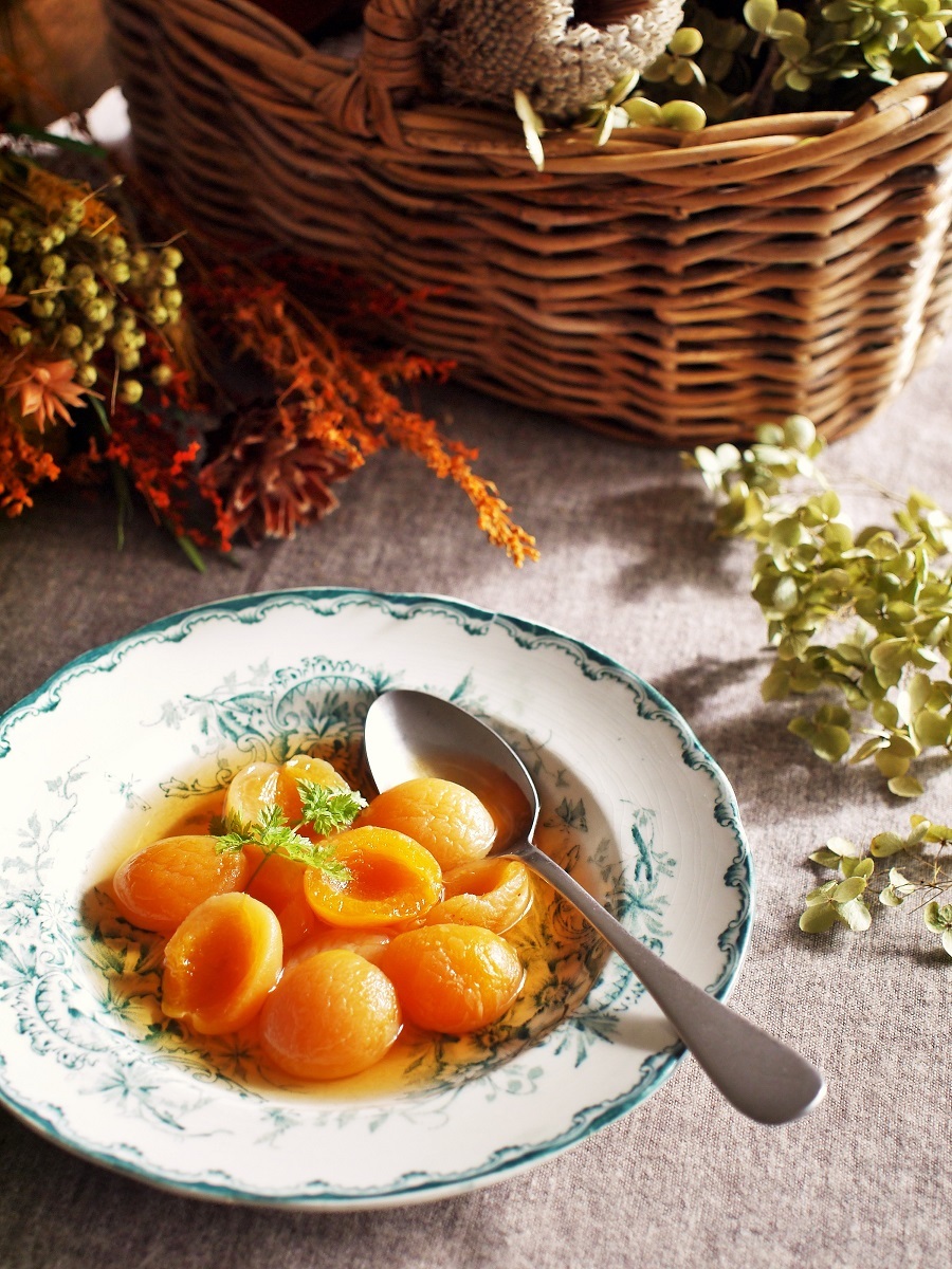 紅茶はアツアツのものを注いでください。保存容器が耐熱でない場合は、冷めてから保存容器に移して。 アイスや、ヨーグルトに添えたり、ドライアプリコットの甘みで美味しい紅茶シロップは、氷を入れてドリンクにするのもおすすめです。 スタイリングは、秋をイメージ。アプリコットのオレンジを基調にしたドライフラワーを添えて、木の籠を置いて温かみを。