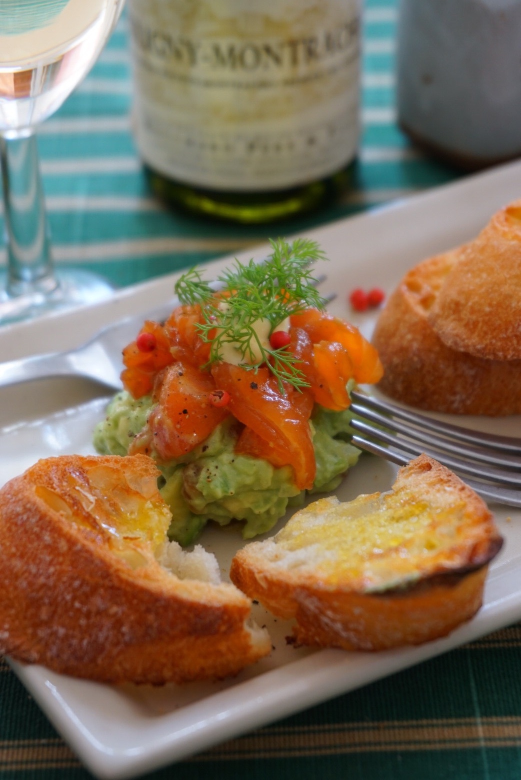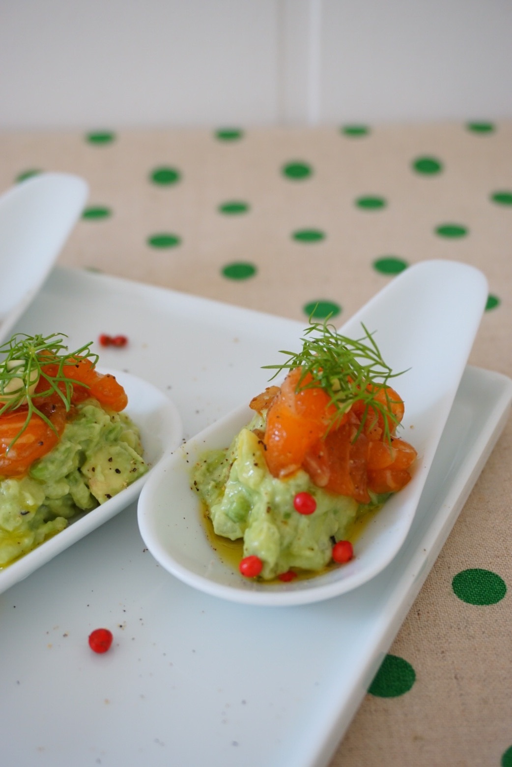 - 皿に6を盛り、その上に残しておいたサーモンをのせピンクペッパー とディルを飾る。