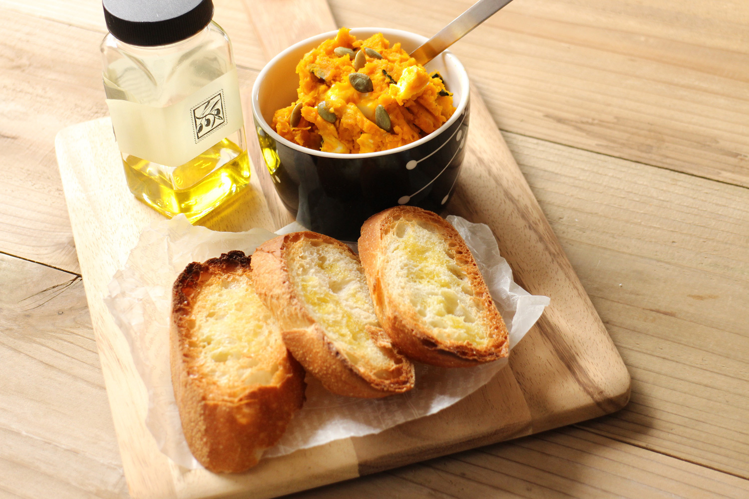 - バゲットを焼き、カッティングボードに乗せる。