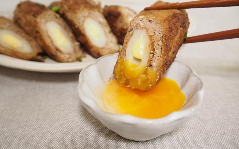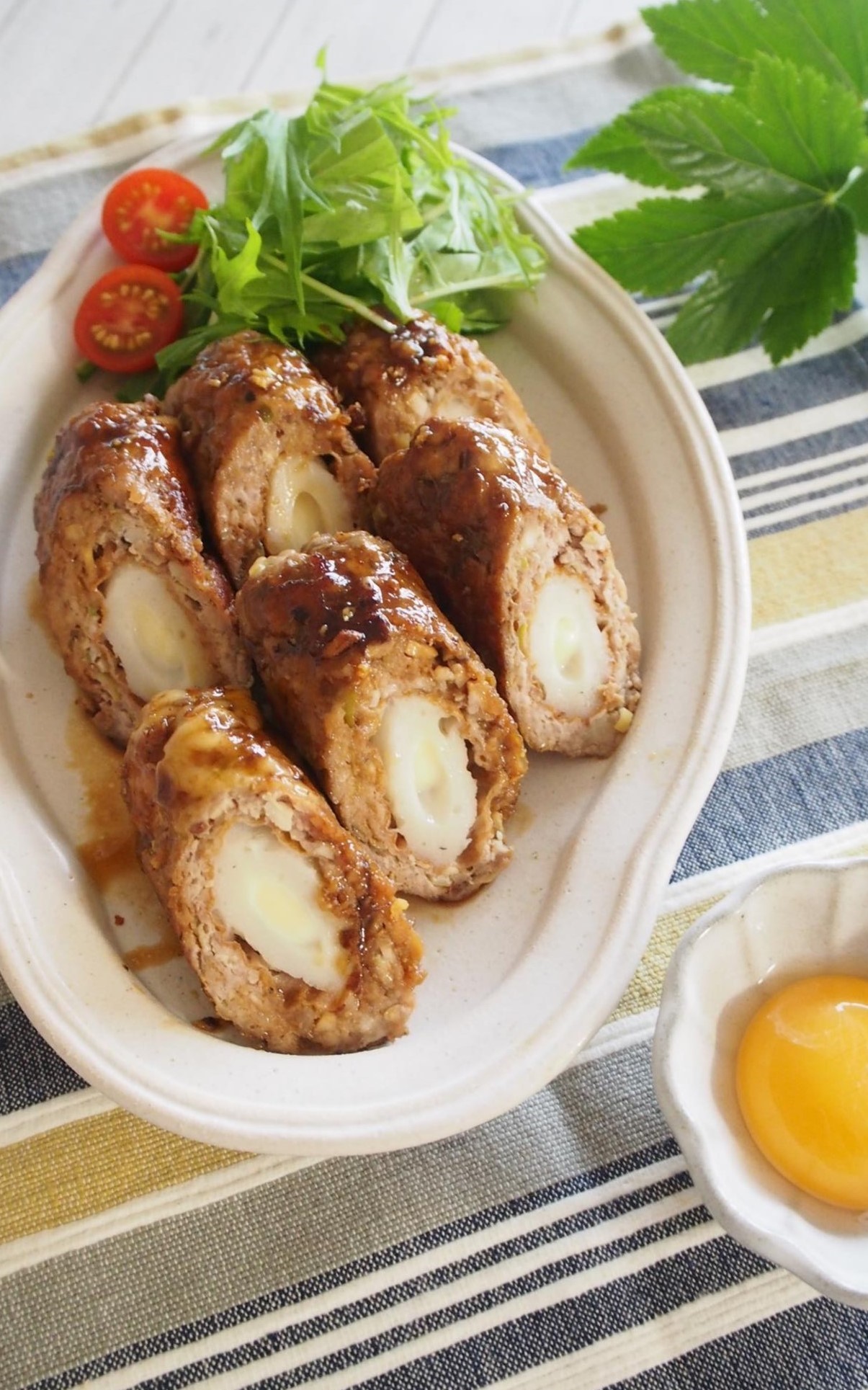 焼いている途中でチーズが溶け出してきやすいので、成形の際に、ちくわの両端を多めに肉だねで覆うようにすると作りやすいです。