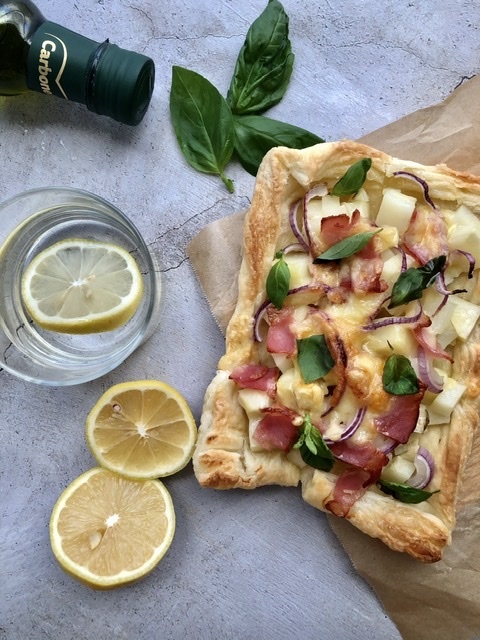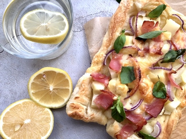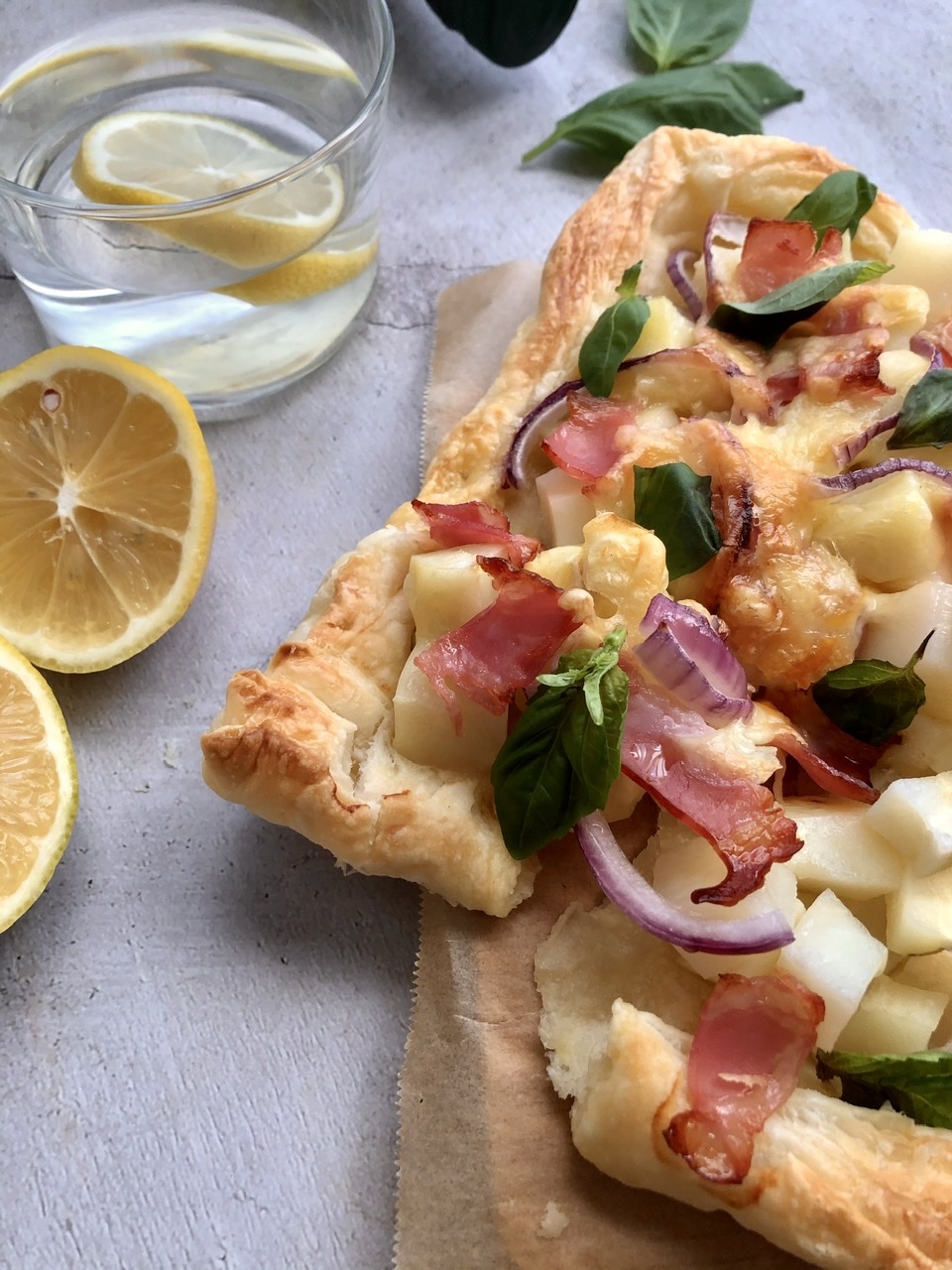 バターの良い匂いが香るベーコンポテトパイです。家にあるものをのせて焼くだけの簡単レシピ。朝ごはんやおやつ、パーティにもぴったりです。
