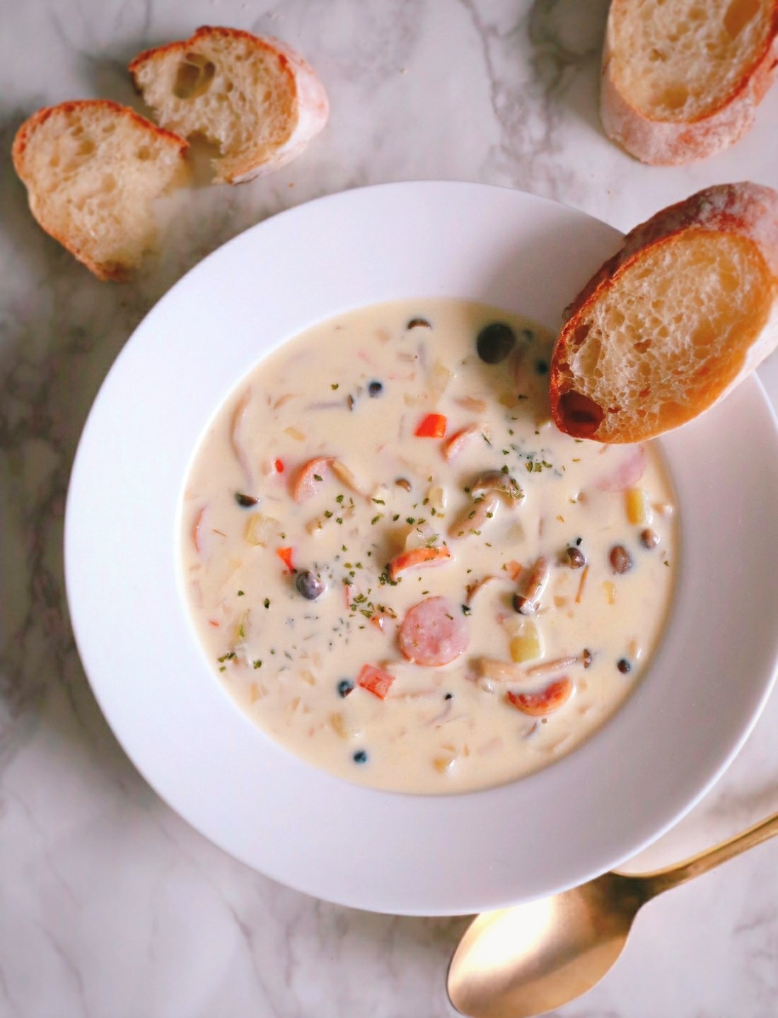 さつまいも入りのほっこり体あたたまるクリームチャウダーです。野菜は皮つきのまま栄養をまるごといただきます。生クリーム、バター不使用ですが濃厚で美味しいですよ♪寒くなってくるこれから季節、是非これを食べてあたたまって下さい。