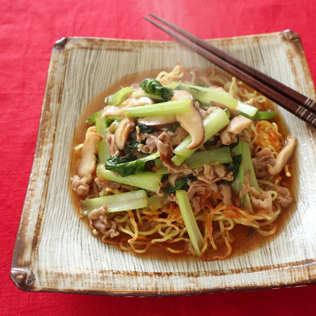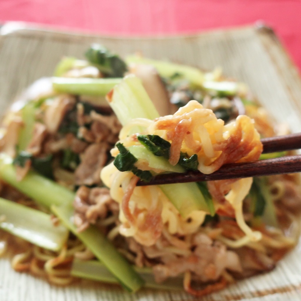 - 麺を手でふんわりとほぐし、火にかけたフライパンに油(分量外)を入れて両面をきつね色に焼く。(裏返した際も油を少量フライパンの縁から回しかける)