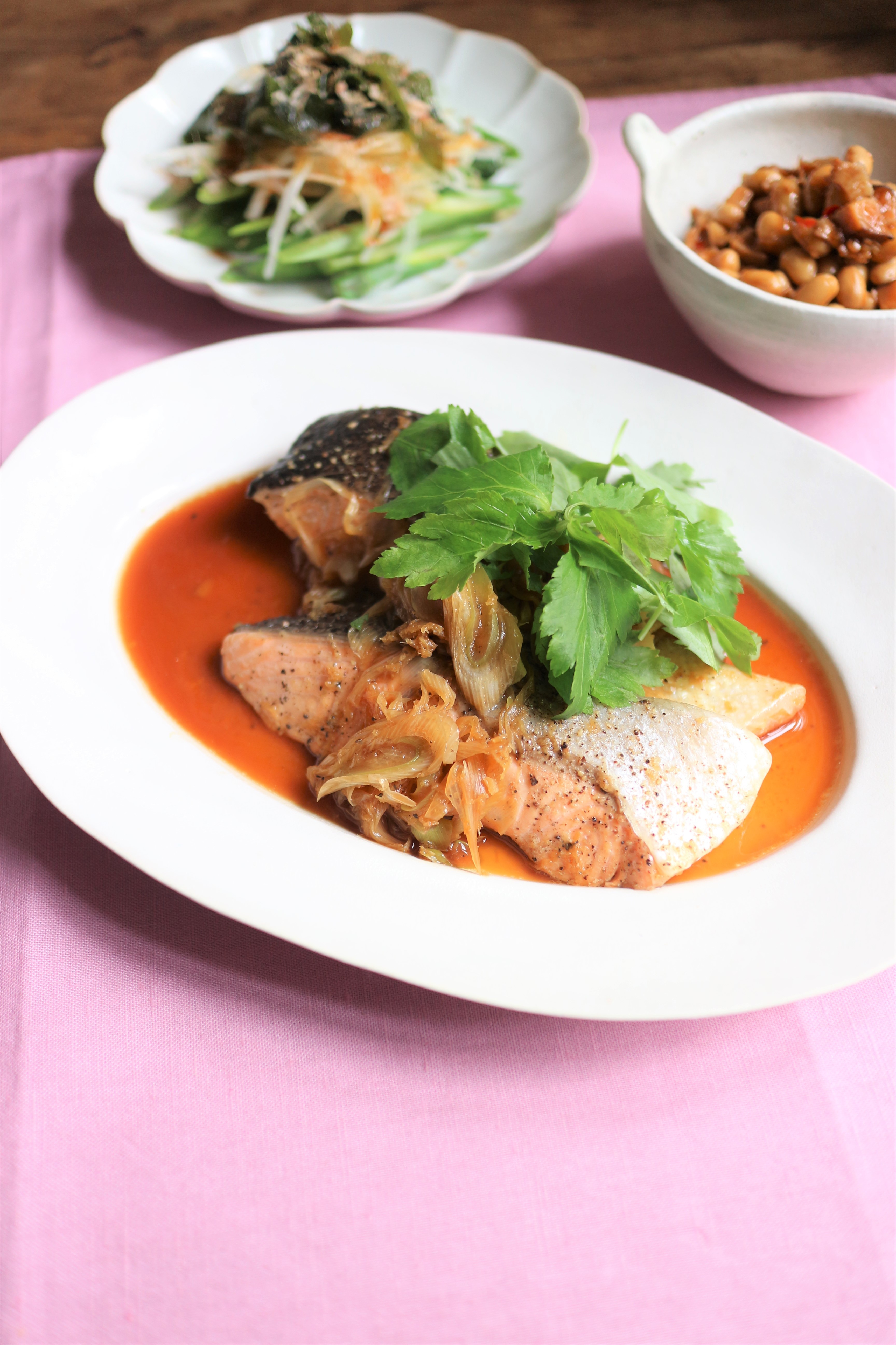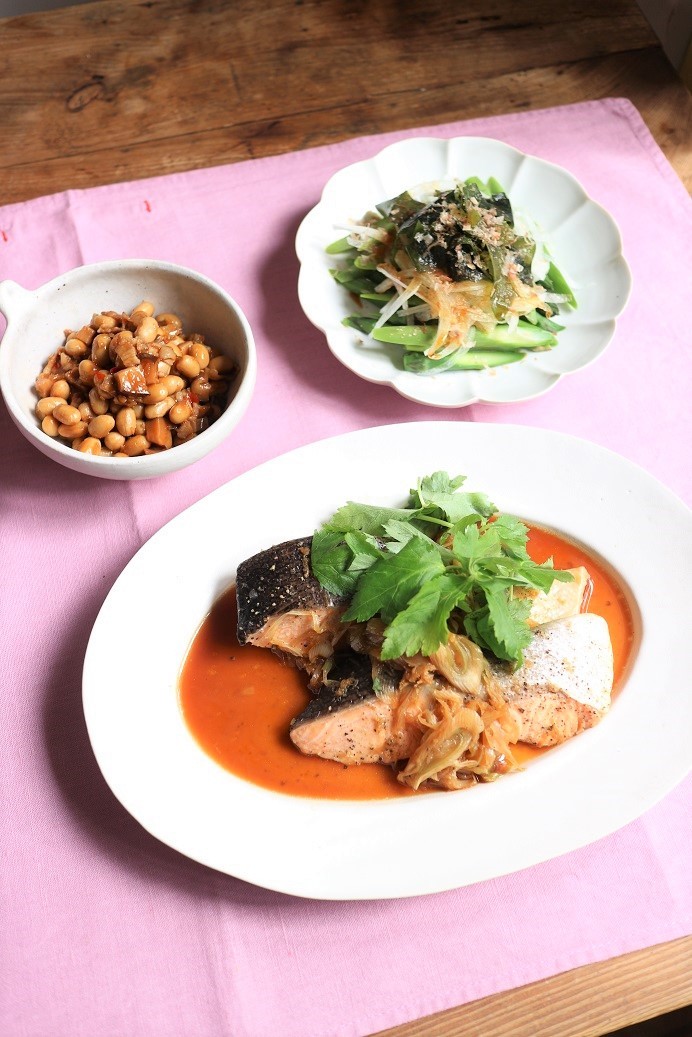 - 鮭のレンジねぎ蒸し・中華風のおかず煮豆・アスパラとわかめのレモン醤油