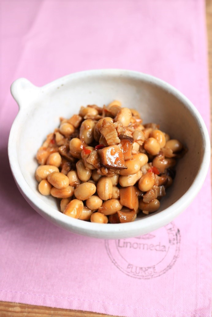 - フライパンにごま油・Aを入れて火にかけ香りを出し、豚ばら肉を入れて炒め色が変わったらしいたけ・大豆水煮を加えて炒め、全体に油が馴染んだら酒・水(50ml)・しょうゆ・オイスターソースを加えて沸かし、蓋をして弱火で10分位煮含め器に盛る。