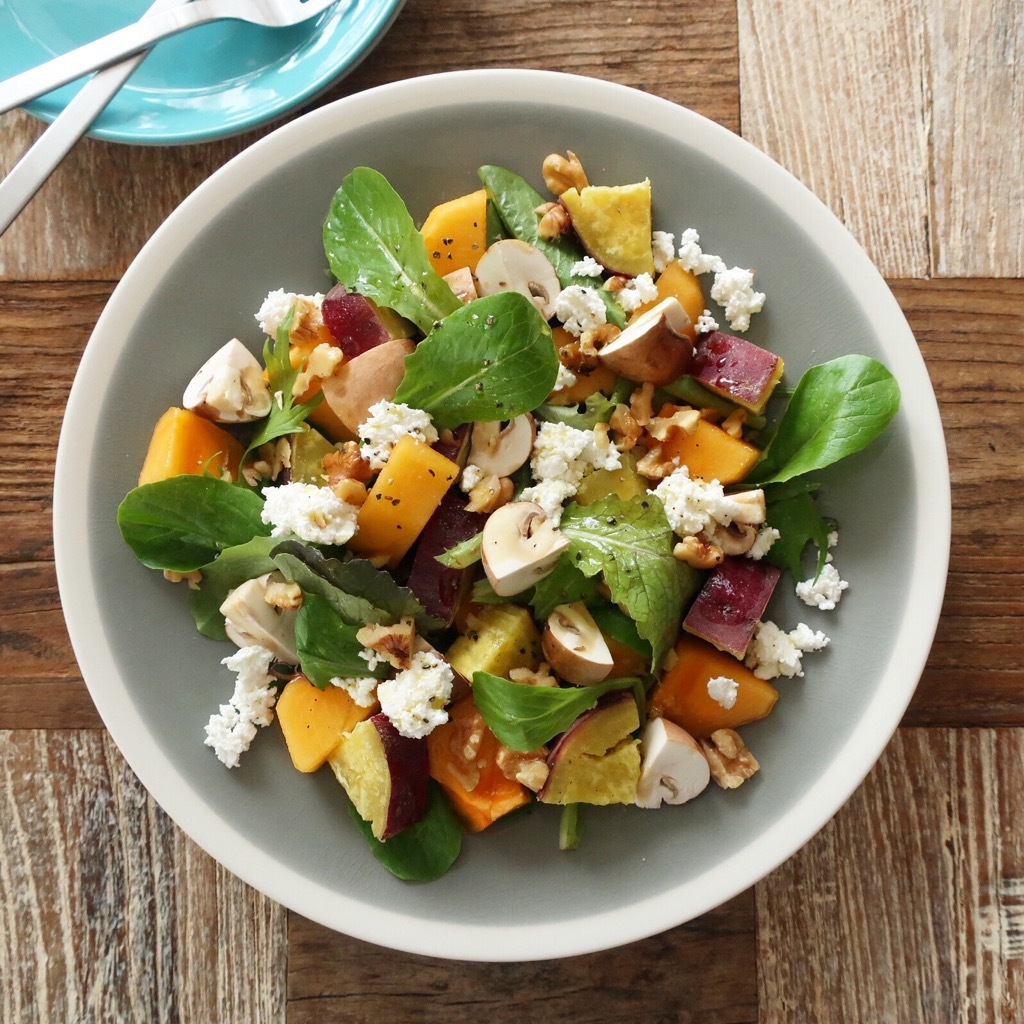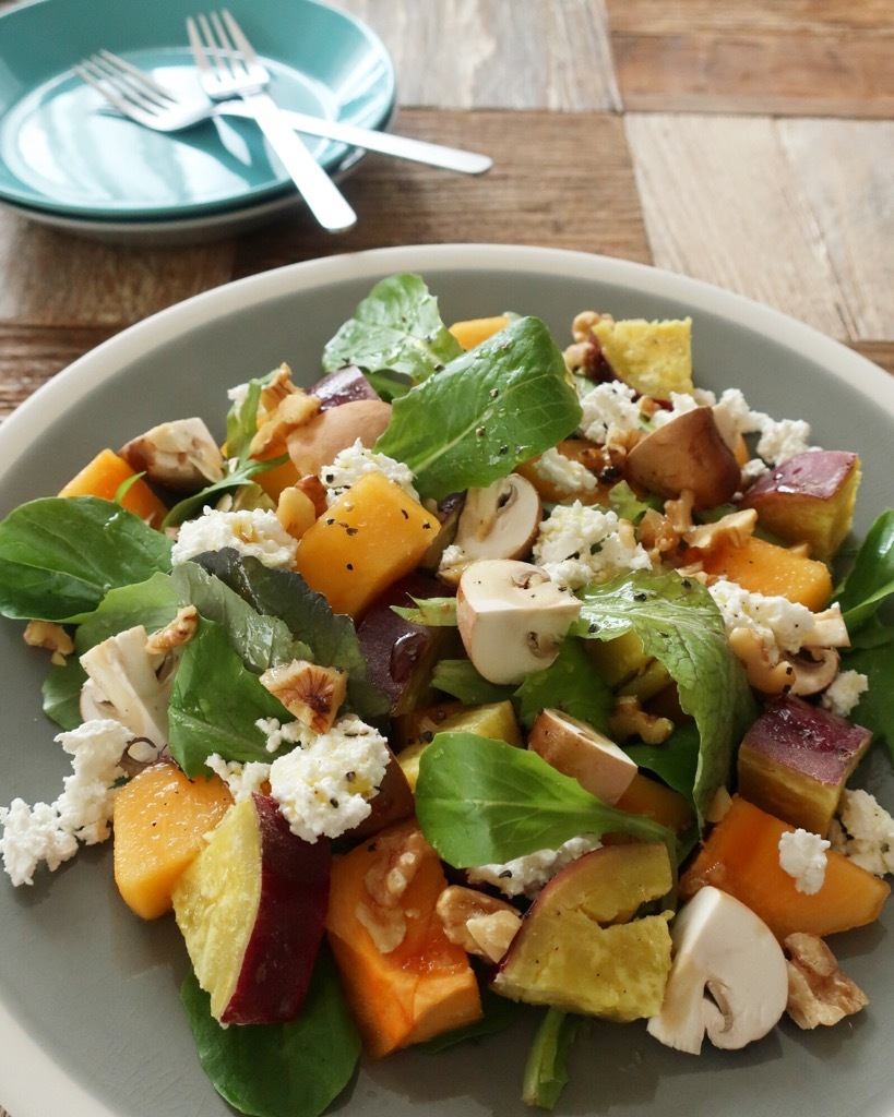 秋に旬の柿とさつまいもをメインにサラダにしました。クルミやチーズも入っているので食感もさまざま、彩りも良く目にも楽しい一皿です。