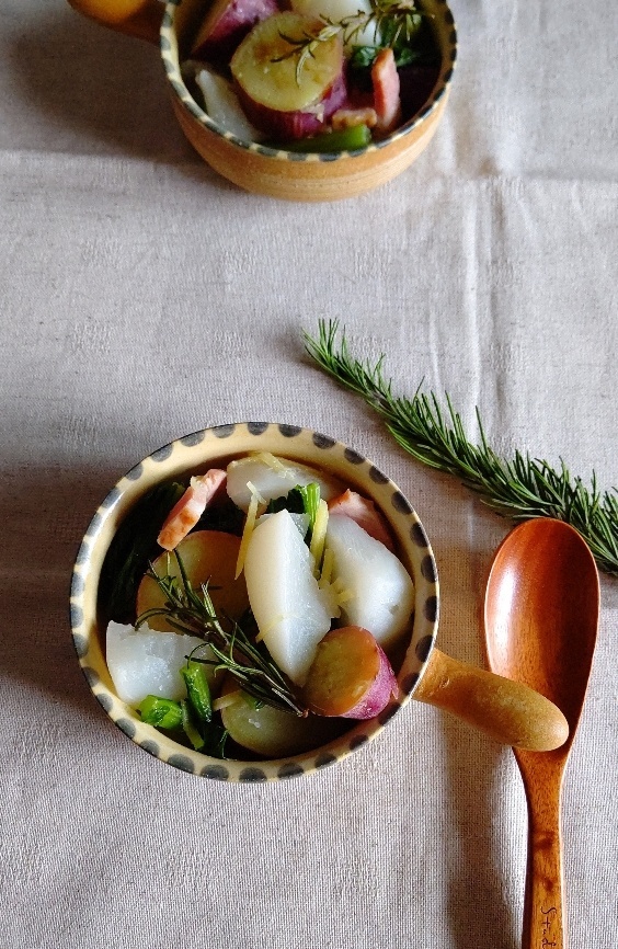- ④さつまいもに竹串をさしてスッと通るようになったら、コンソメとローズマリーを加え中火で3分程煮る。
