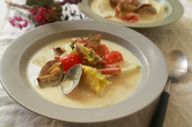 - 鍋にあさりと水とタイムを入れ蓋をして中火で1分程蒸し煮にする。あさりの口が開いたら蓋を開け、ベーコンと白菜の芯、豆乳を加え中弱火で5分煮る。