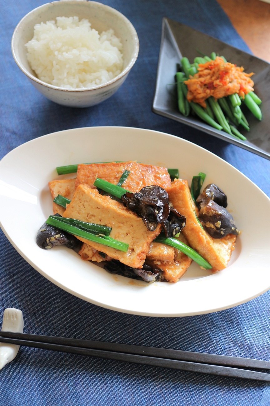 - 厚揚げときくらげのオイスターソース炒め・いんげんとツナの辛味あえ