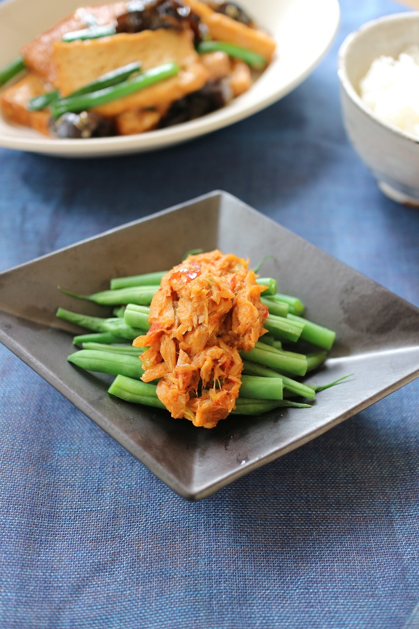 - <いんげんとツナの辛味あえ>いんげんを塩茹でし半分に切り、ツナ缶は油をきる。