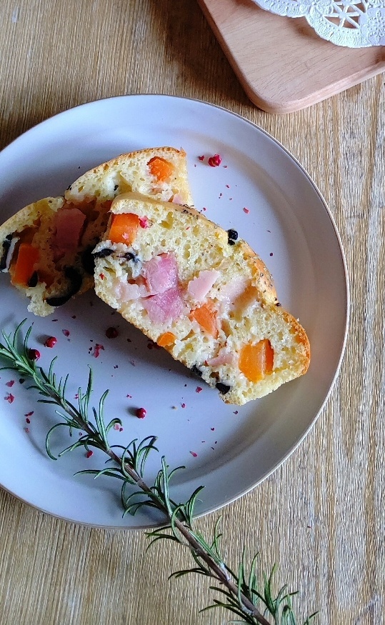 - ①ブロックベーコンとにんじんは1cm角に切る。ブラックオリーブは5mm幅に輪切りにし、生姜は皮を剥いてすりおろす。
