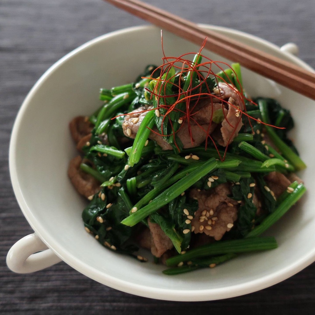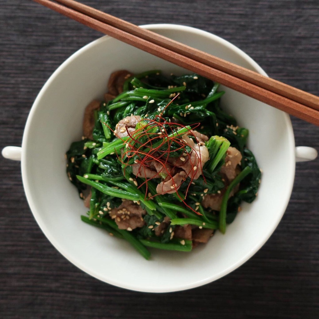 ボウルに1とほうれん草を入れて混ぜ合わせ器に盛り付け糸唐辛子を添える。