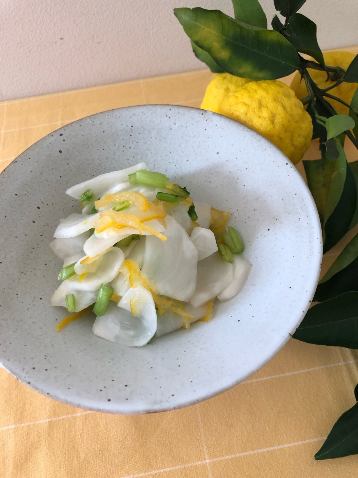 ゆずマーマレードでも、市販の果肉たっぷりのゆず茶でもカブの酢の物が作れちゃう!色合いも上品ですよん♪