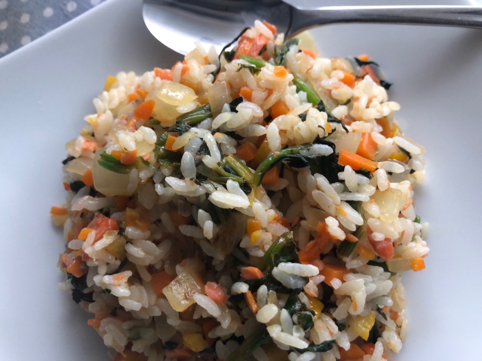 - 熱したフライパンにオリーブオイルをいれる。にんじん、玉ねぎを入れて火が通ったらゆずをいれさらにいため、鮭、ほうれん草をいれ、塩胡椒、醤油をいれよく炒める。