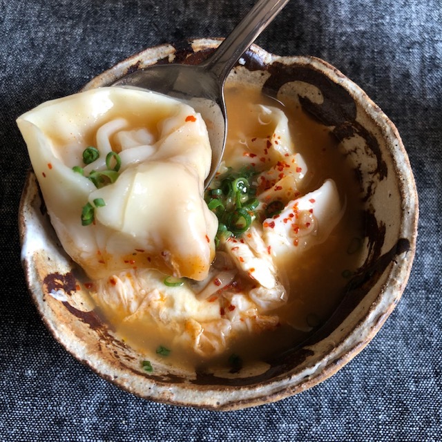 - 2を6等分にし餃子の皮にのせ帽子型に包む。