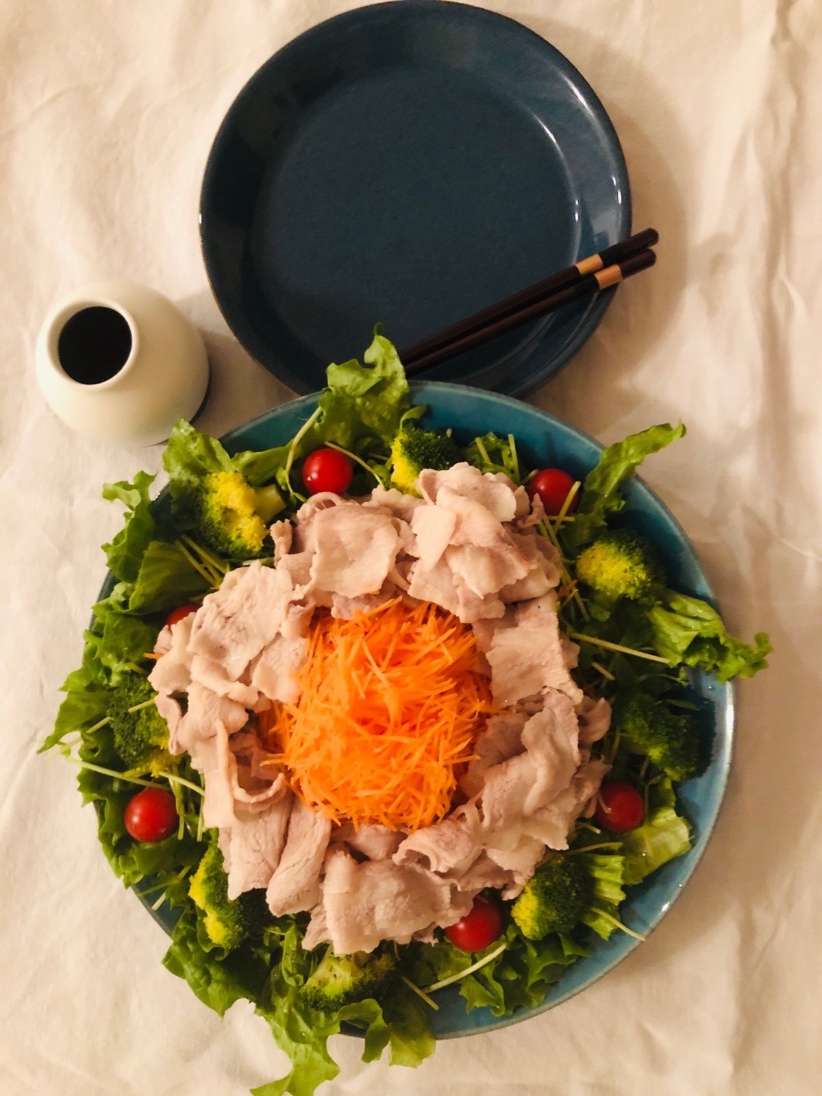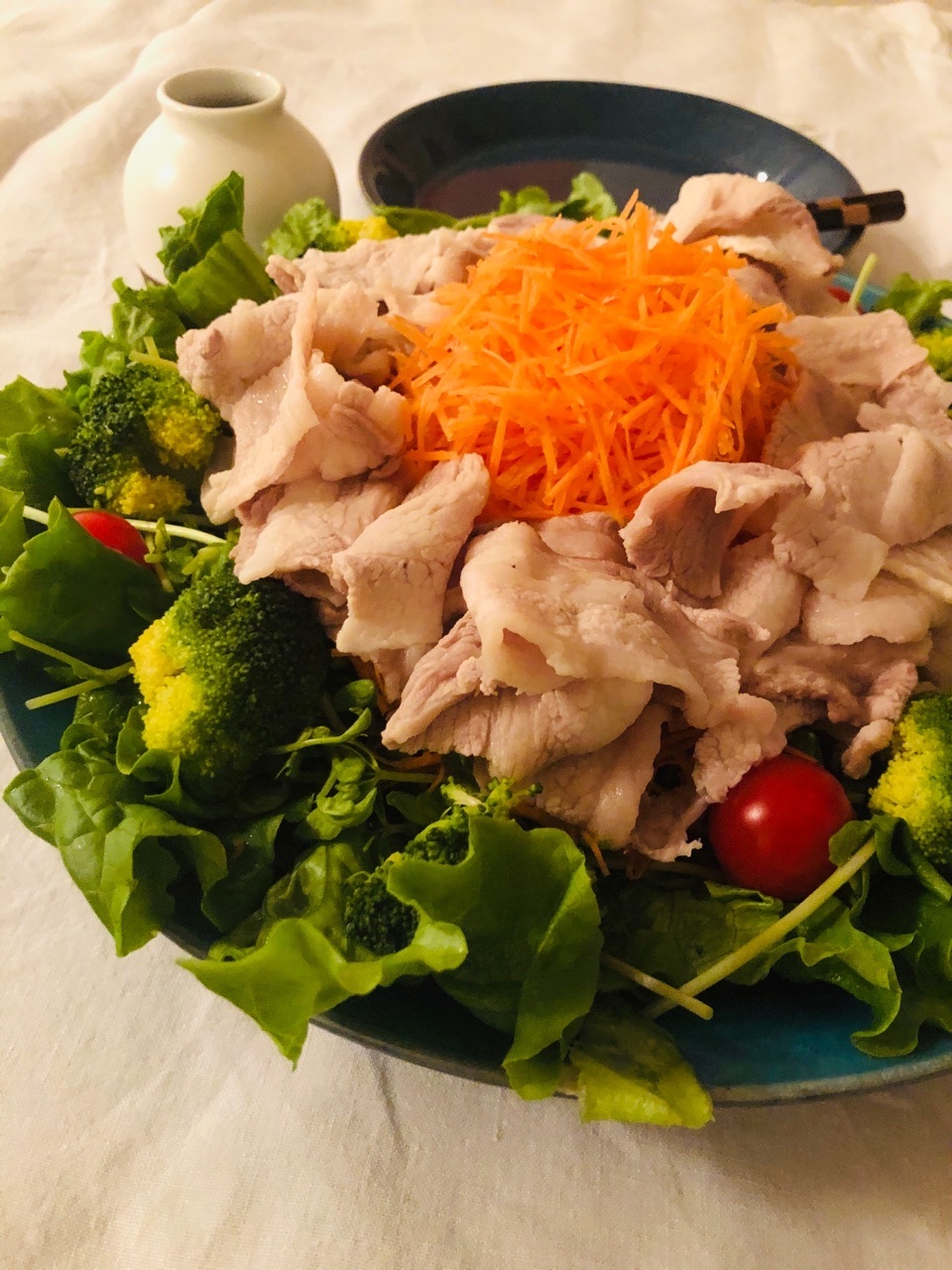- 器に盛り付ける。フリルレタス、豆苗、たっぷりなにんじん、豚肉、プチトマト、ブロッコリーの順に盛り付ける。