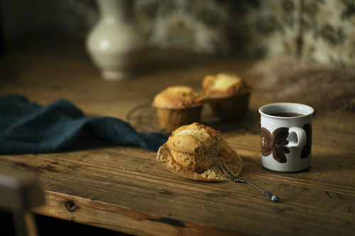 焼き菓子の素朴さを損なわないよう、色のトーンは統一。無垢の天板、リネン生地で色、素材をナチュラルでシンプルなもので統一すると全体のイメージがまとまります。