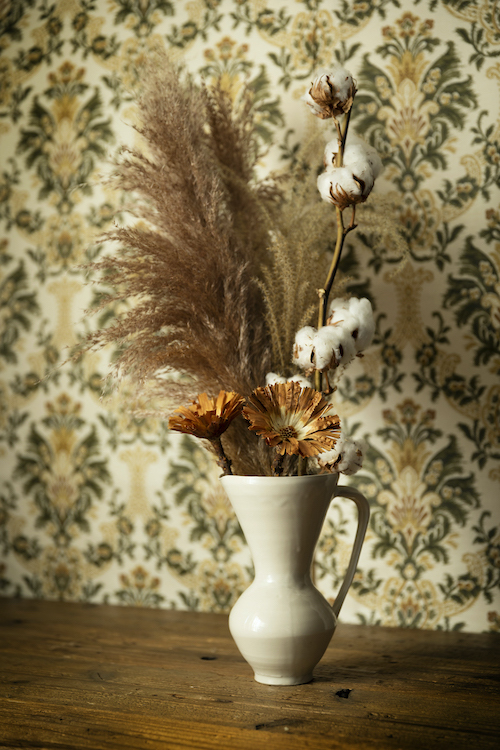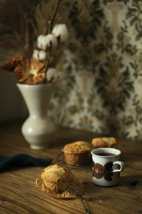 キーワード:ナチュラル、素朴、シンプル 冬のほっこりおやつタイムをイメージし、スタイリング。 素朴な焼き菓子のイメージを損なわないよう、無垢の天板を用意。壁紙は色のトーンを統一することで目立ちすぎず、視覚的に飽きさせない効果が。 全体に茶色いトーンになりがちなところに、濃紺のリネンクロスをいれ全体のアクセントとしました。