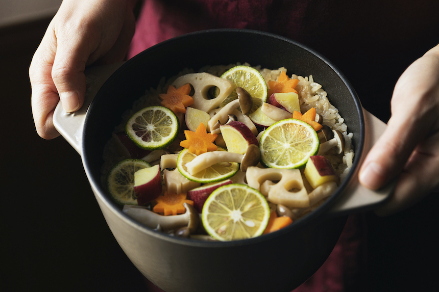 キーワード:秋、新米、丁寧なくらし、手料理、和食 秋の新米の季節をイメージし、新米と秋を彩る食材(きのこ、銀杏、人参、さつまいも、すだち)をつかった炊き込みご飯を作成。 鍋ごと手でもつことで、手料理のよさや、丁寧なくらしを想起させるようスタイリングをしました。
