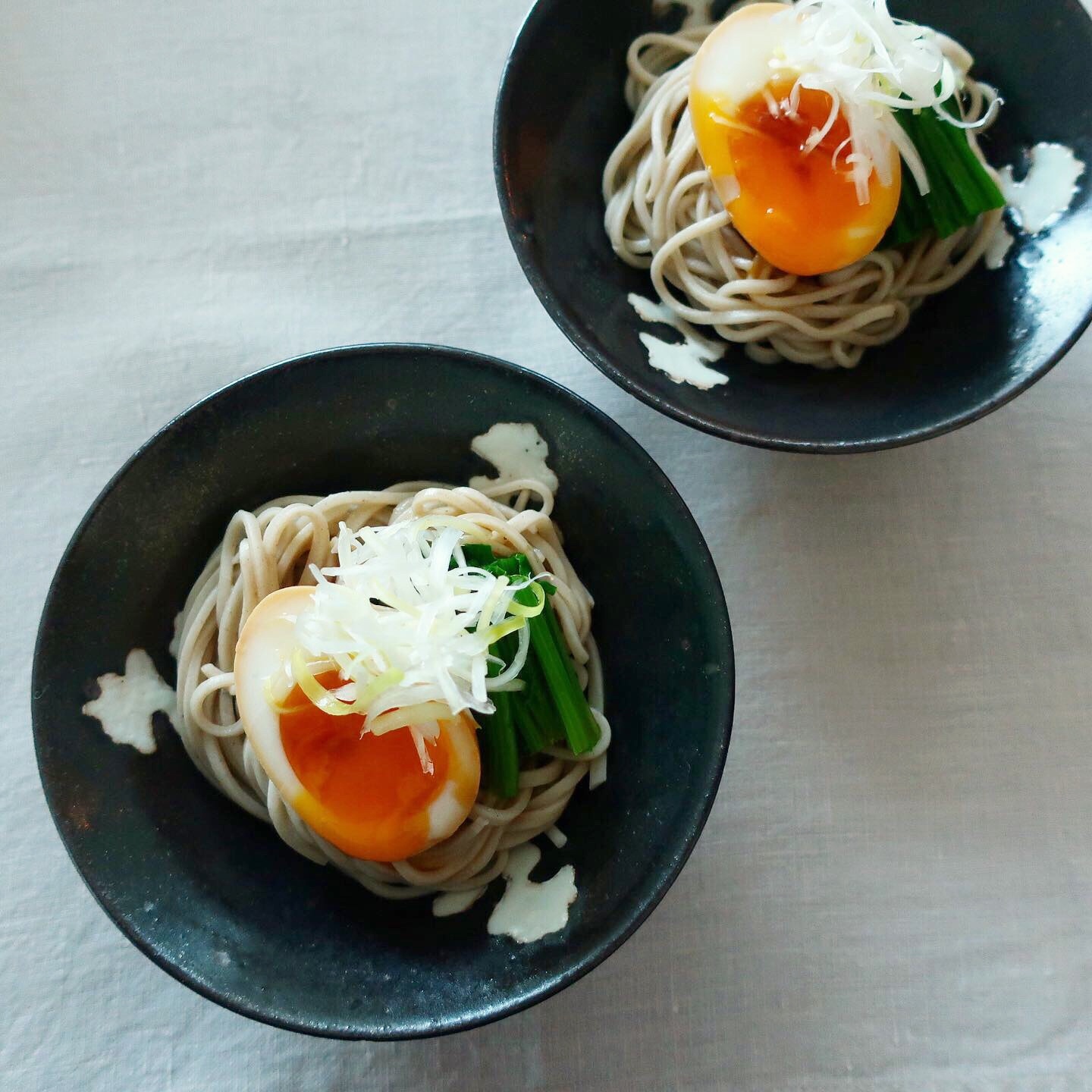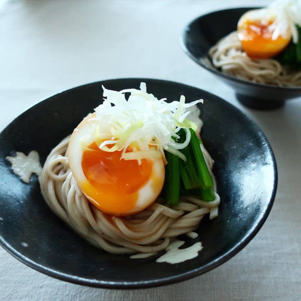 とろ~り煮卵を冷たいおそばにトッピング。