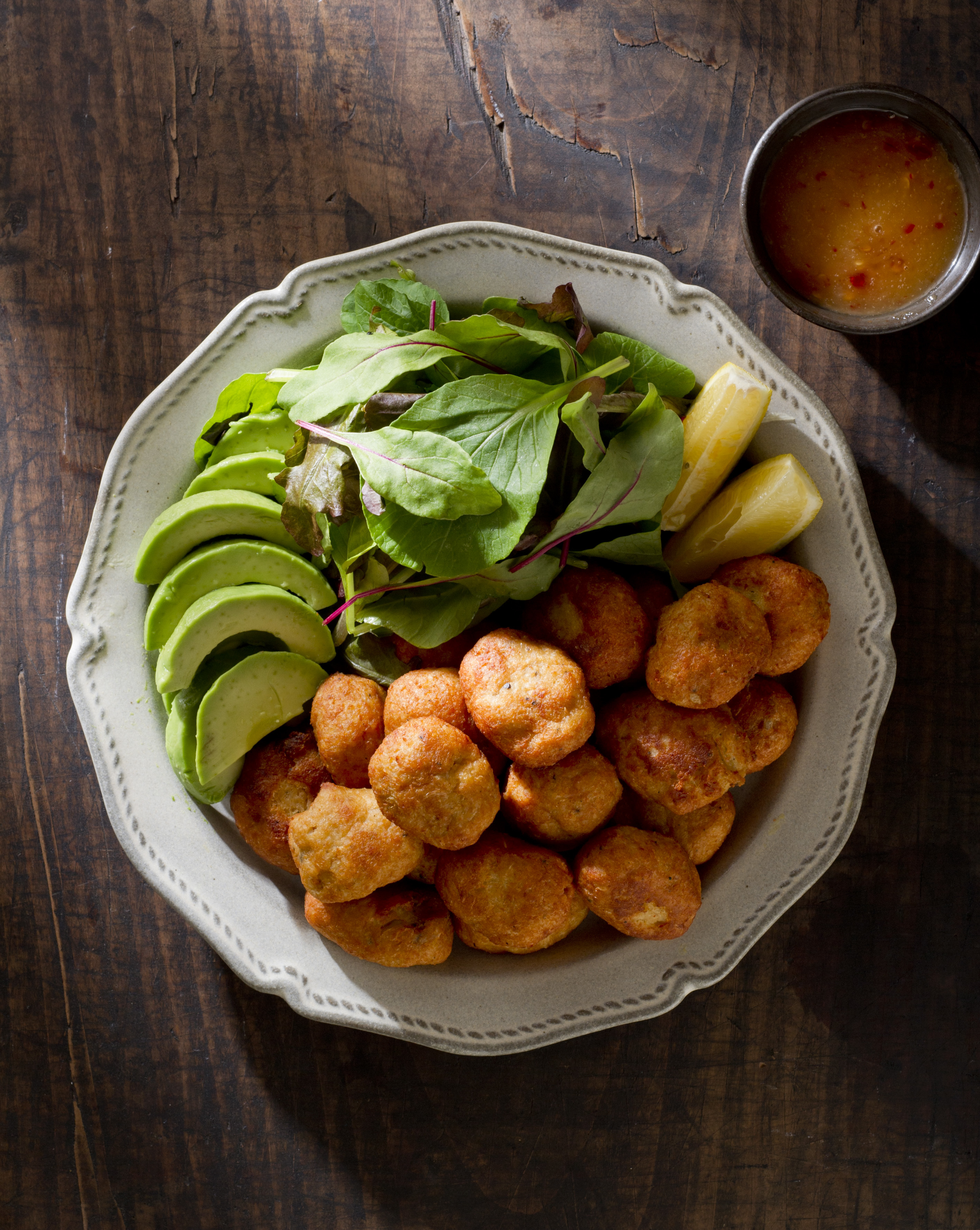 - スイートチリソースとコンデンスミルクを混ぜたソースをつけていただく。