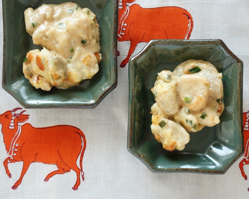 - 鍋に水とさといもを入れて火にかけ、竹串がすっと刺さるまで茹でる。熱いうちに皮をむきグラタン皿に入れて少し形状がわかるくらいにフォークでつぶし小ネギと混ぜ合わせる。