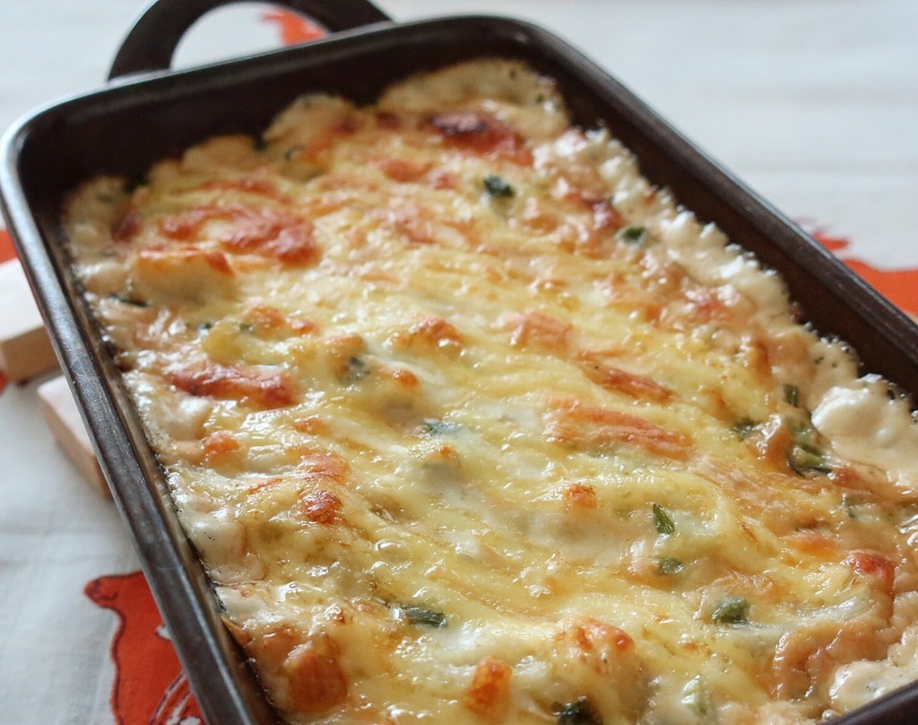 - 2を1にかけ、軽くかき混ぜたらマヨネーズ、チーズをトッピングし、240℃のオーブンで15分焼く。