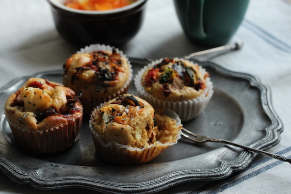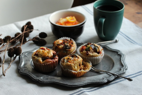 - マフィン型にパラフィン紙を敷き、3の生地を4等分にいれ、2の野菜をのせ、ドライバジルをふる。180度に予熱したオーブン(中段)で20分焼成する。