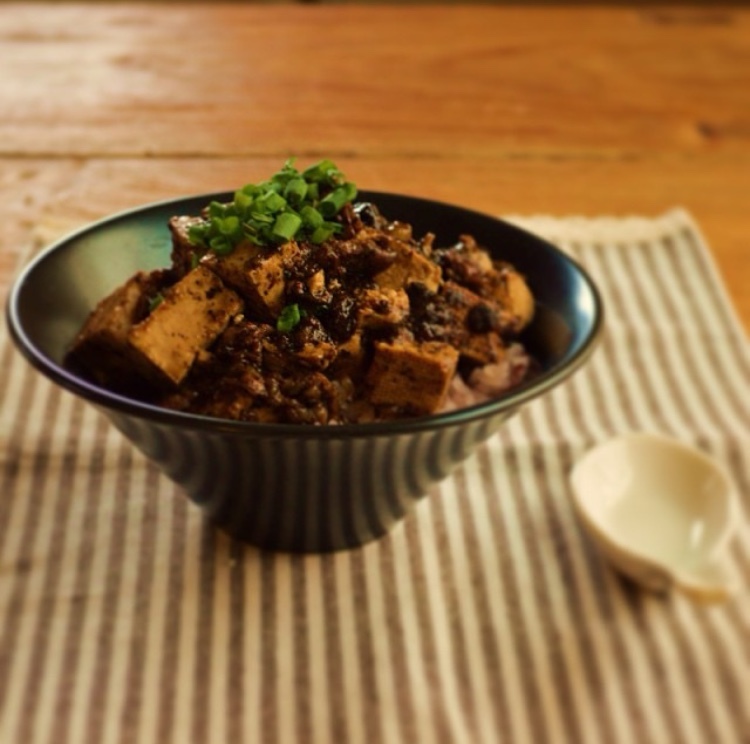 - フライパンにごま油、みじん切りしたしょうが、にんにく、豆板醤、豆鼓を入れて火にかけ香りが出たら肉を加えて炒める。