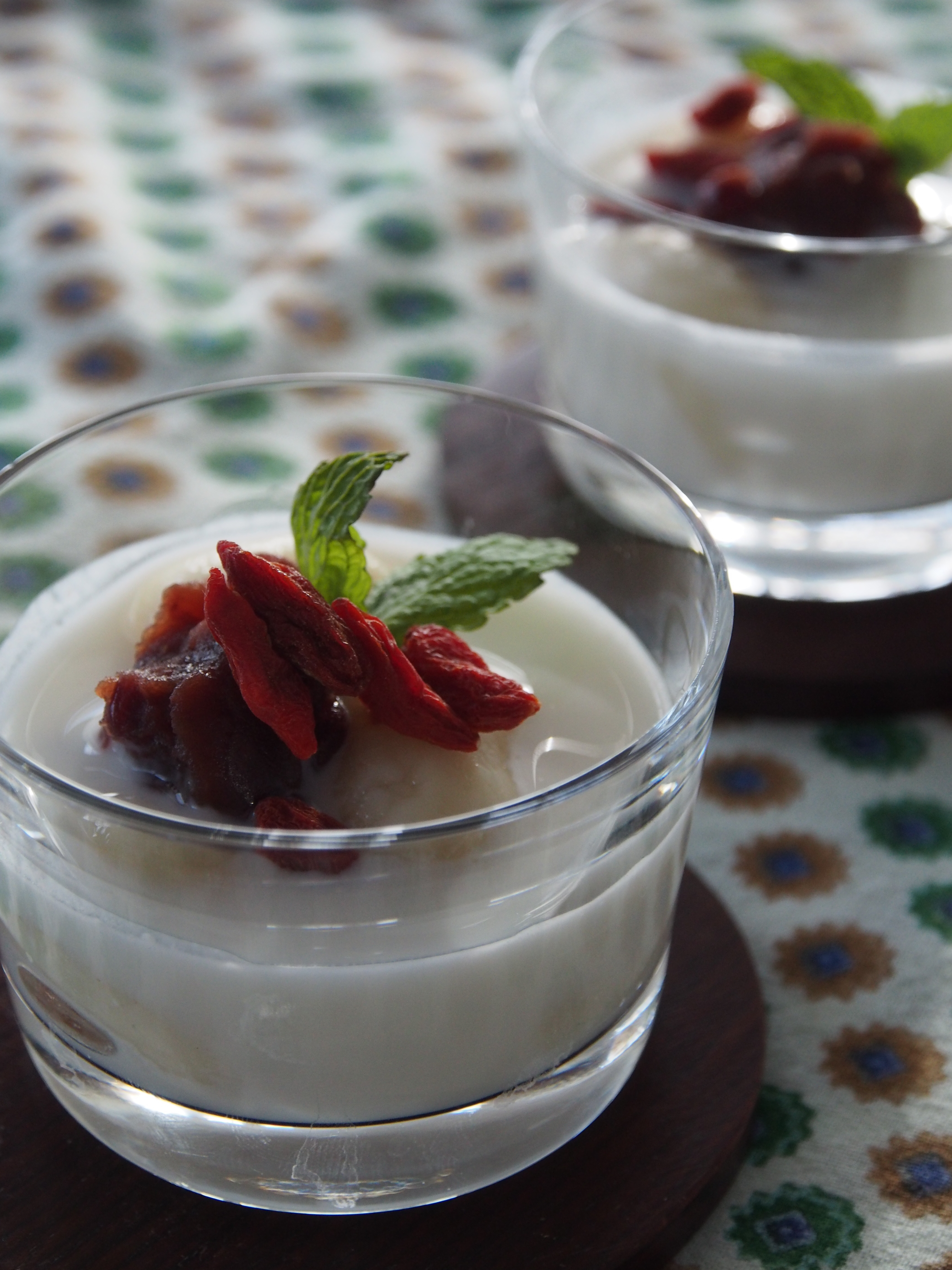 - 器に白玉団子を入れ、ココナッツミルクソースをかけくこの実、ミントを飾る。