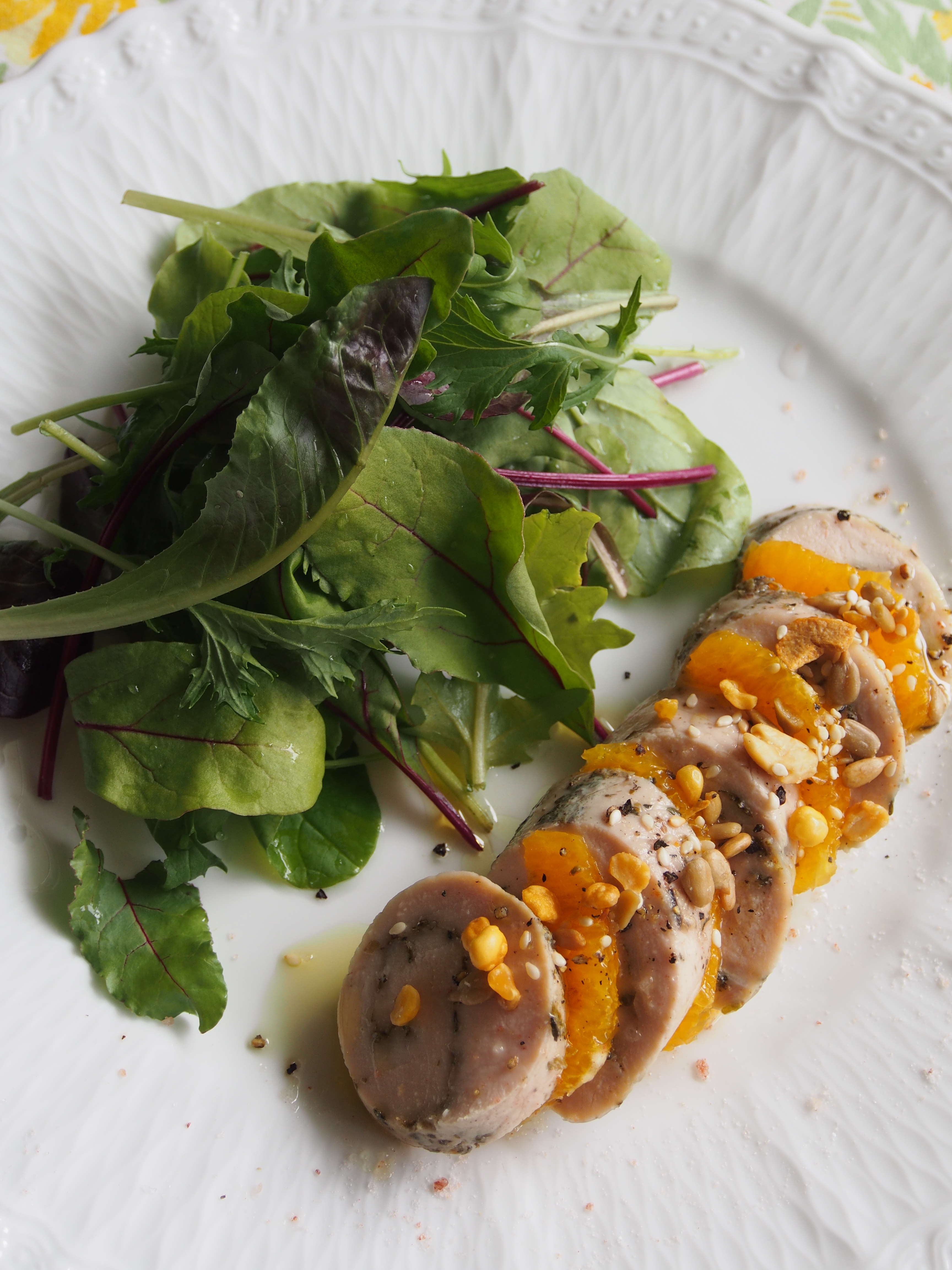 - 出来上がったチキンハムとオレンジをスライスして更に盛り付ける。