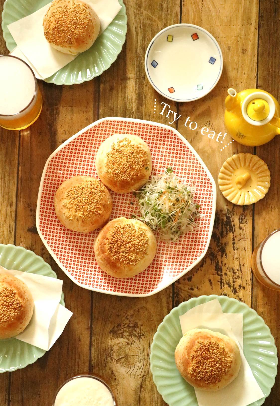 3を1つづつ手のひらで1cmほどの厚さにし、肉だねを1/6づつ包む。すべて包んだらまわりにごま油を塗り上にごまを乗せ、200℃に予熱したオーブンで15分こんがり焼き色がつくまで焼き、皿に盛る。