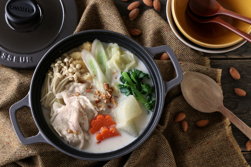 アーモンドミルクを使用したあったか鍋。 全体は暗めのものを使用して、料理の白が目立つように。 レシピ:荻ありす