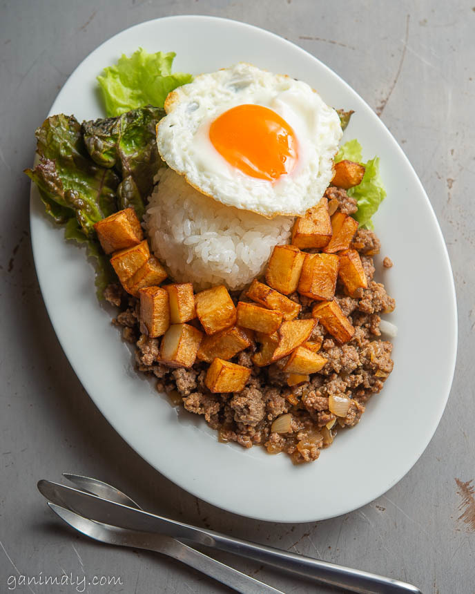 - さらにレタスを敷き、ご飯をもって、5のミンチと揚げたジャガイモ、目玉焼きをのせる。