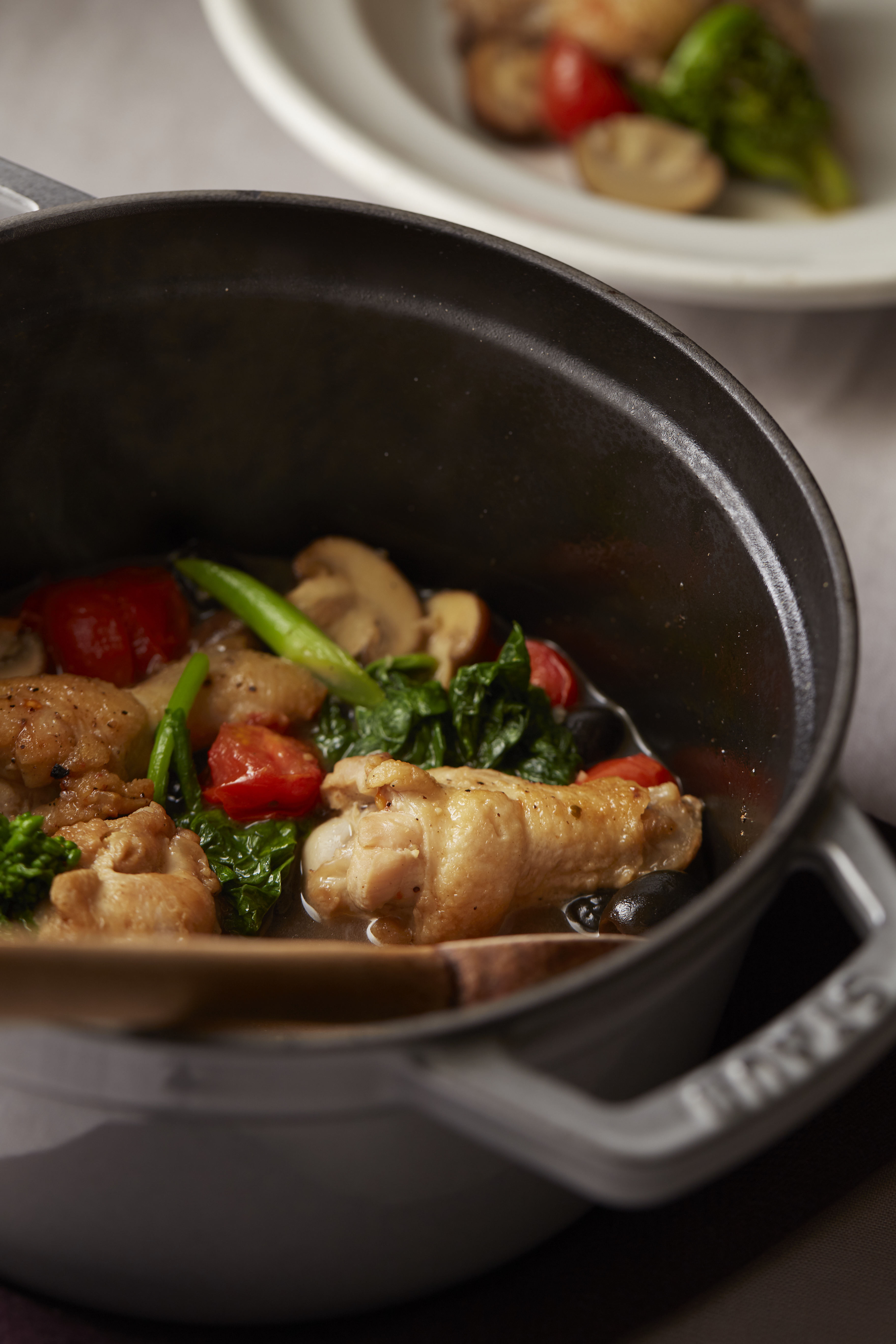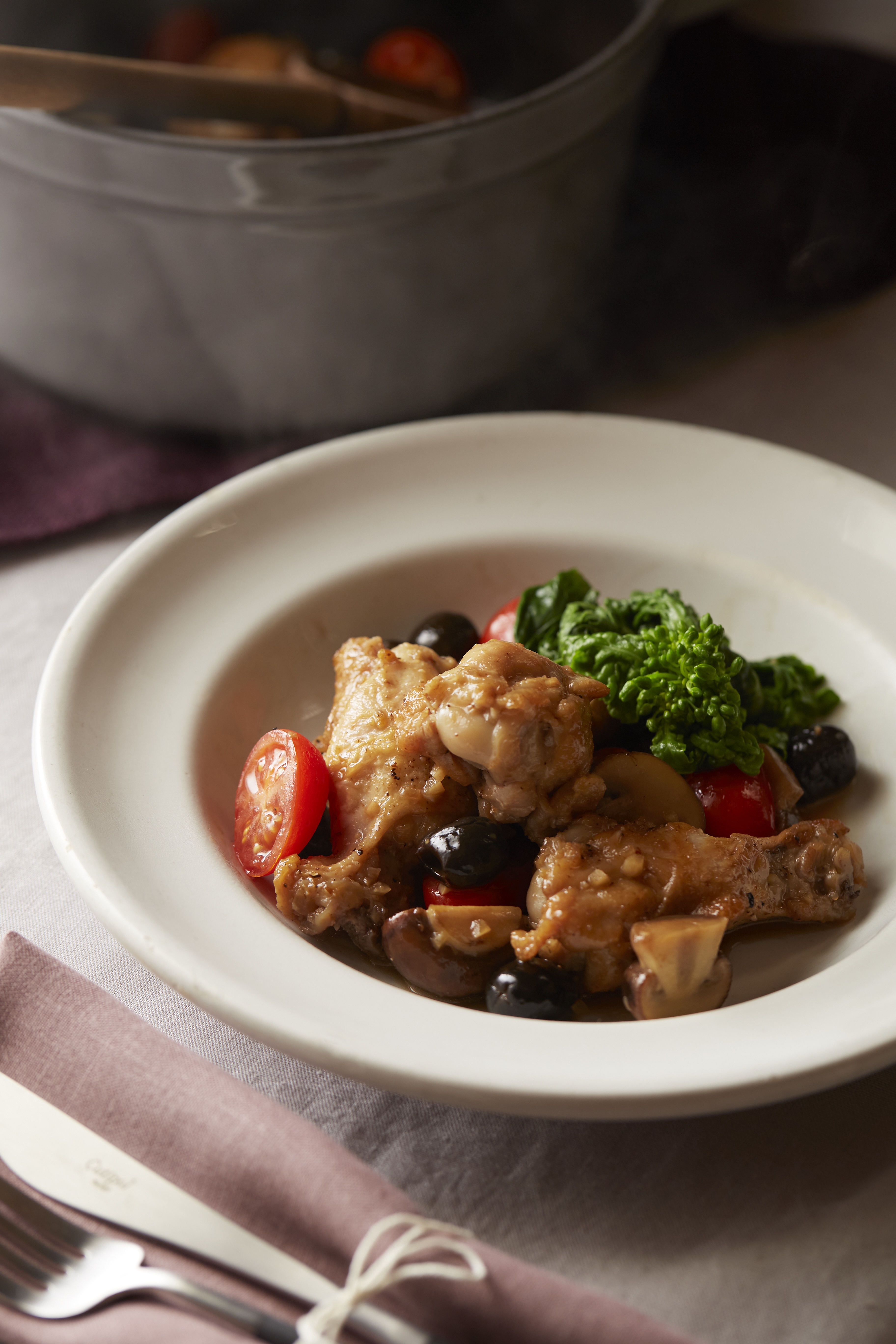 - 鍋に大さじ1のオリーブオイルを熱し、にんにくを炒める。香りが立ったらマッシュルームを加えオリーブオイルが馴染むまで炒める。焼いた手羽元、ブラックオリーブ、水、固形コンソメ、白ワインビネガー、砂糖を加えて10分煮る。