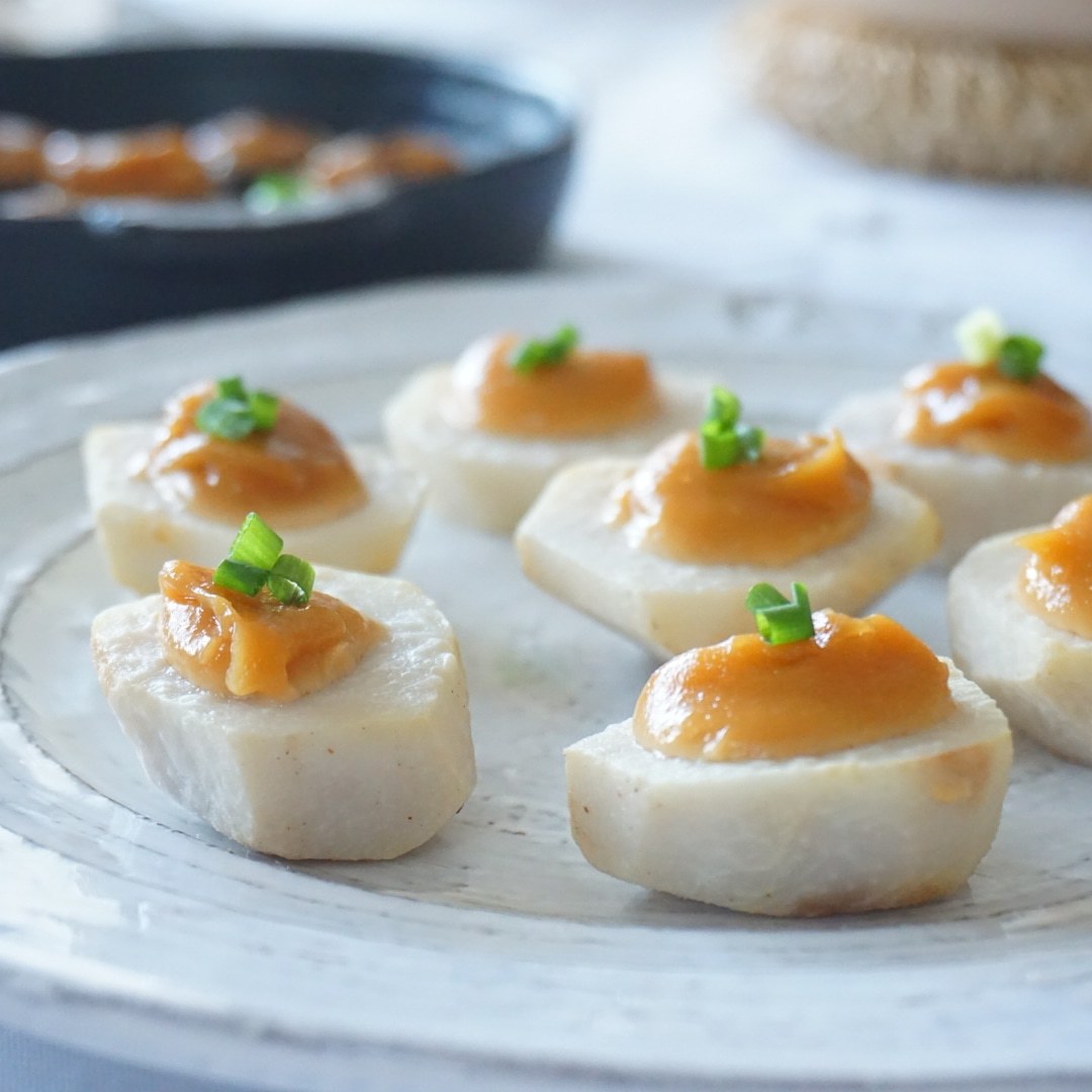 - 里芋に柚子みそを乗せ、トースターで焼き色がつくまで焼く。お皿に盛りわけぎを乗せる。