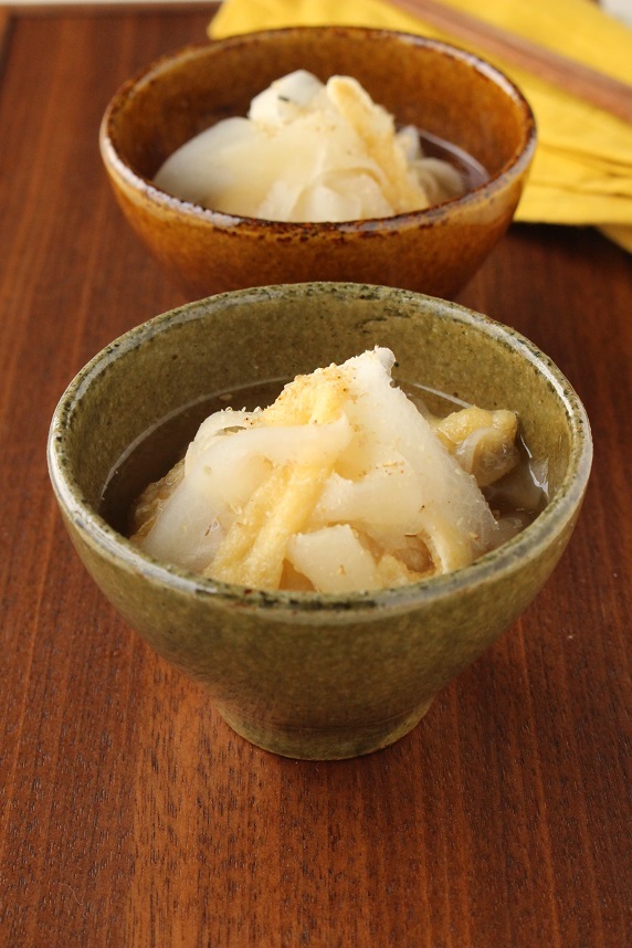 - 大根は皮をむき、ピーラーで切る。油揚げは5mm幅に切る。