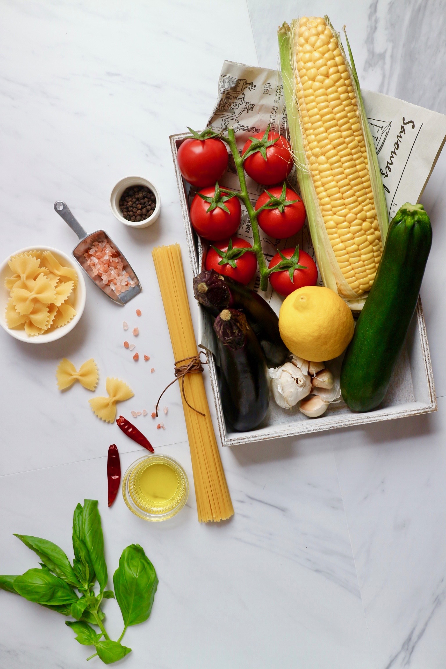 彩りの良い夏野菜を使ったパスタを作るイメージでスタイリングしました。