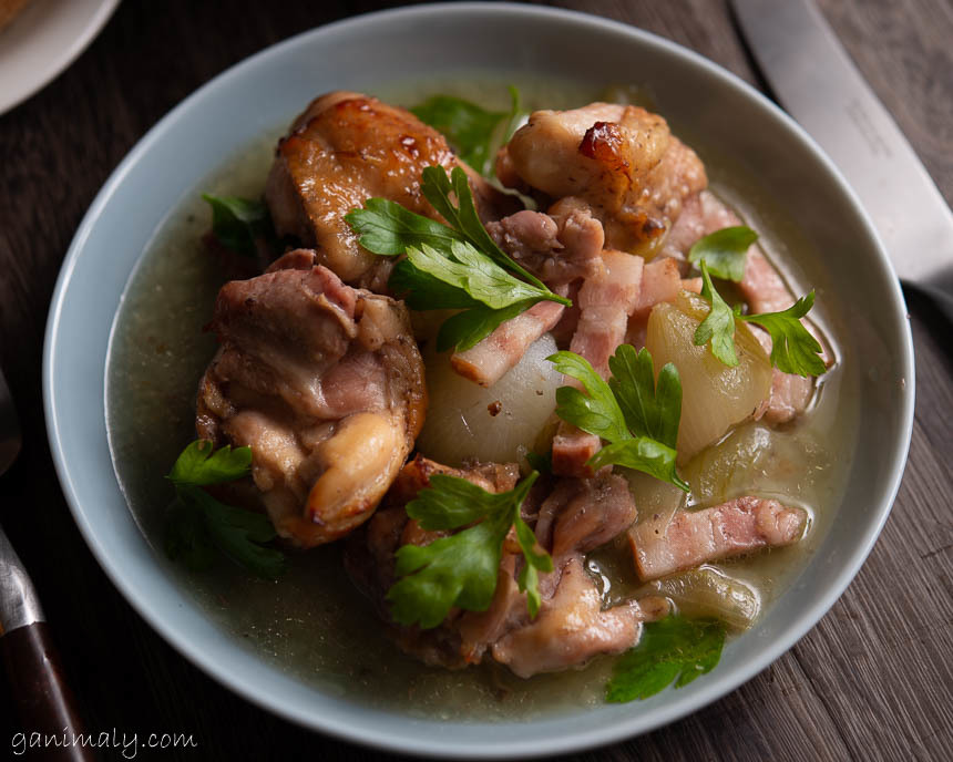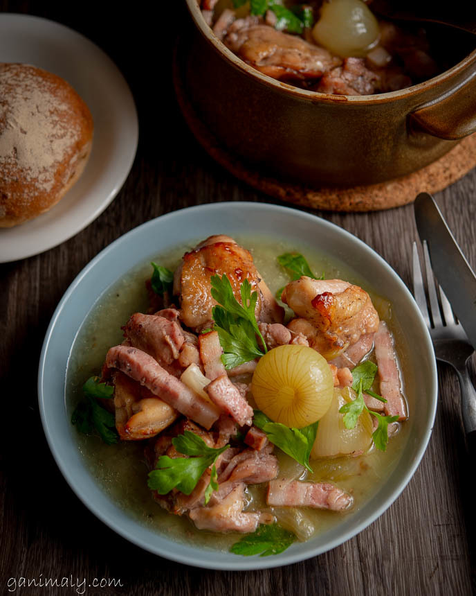 - 耐熱鍋に、ベーコン、ラード、ブランディ―、ポートワインを入れ、鶏肉と、皮をむいた丸ごとの小玉ねぎをのせて、蓋をせずにオーブンに入れ20分加熱する。